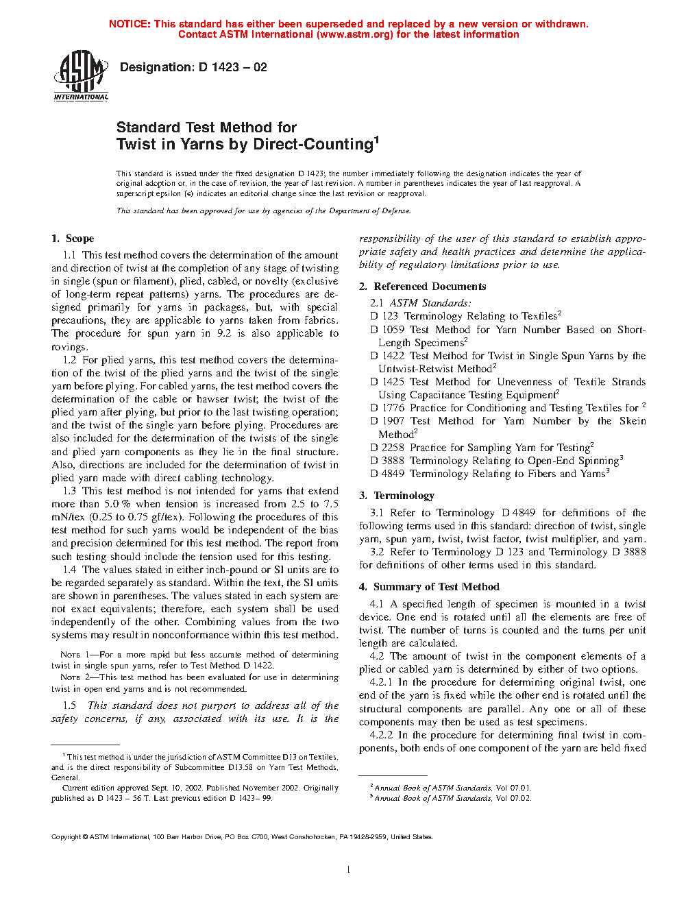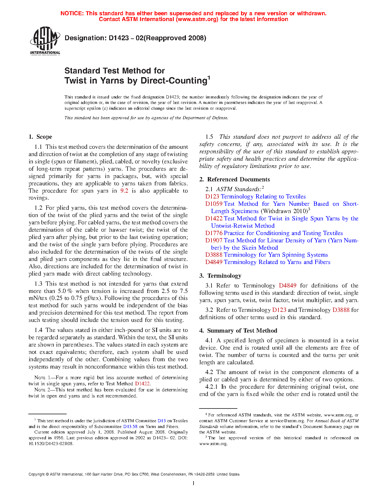 1.2 For plied yarns, this test method covers the determination of the twist of the plied yarns and the twist of the single yarn before plying. For cabled yarns, the test method covers the determination of the cable or hawser twist; the twist of the plied yarn after plying, but prior to the last twisting operation; and the twist of the single yarn before plying. Procedures are also included for the determination of the twists of the single and plied yarn components as they lie in the final structure.
