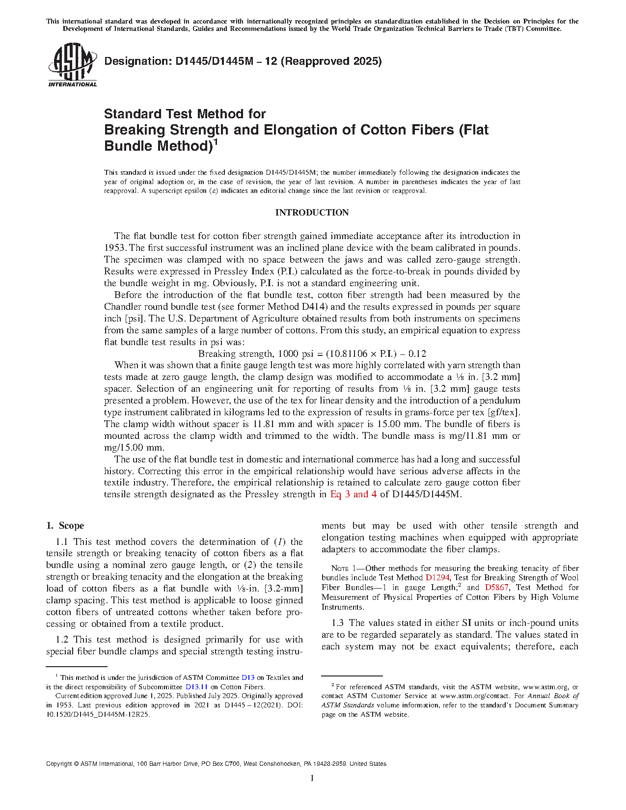 1.1 This test method covers the determination of (1) the tensile strength or breaking tenacity of cotton fibers as a flat bundle using a nominal zero gauge length, or (2) the tensile strength or breaking tenacity and the elongation at the breaking load of cotton fibers as a flat bundle with 1/8-in. [3.2-mm] clamp spacing. This test method is applicable to loose ginned cotton fibers of untreated cottons whether taken before processing or obtained from a textile product.