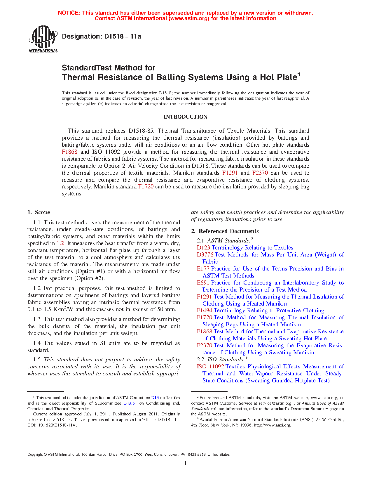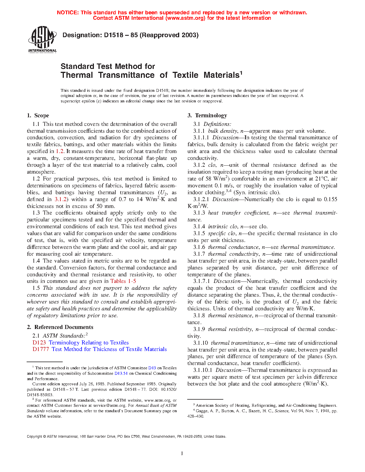1.1 This test method covers the determination of the overall thermal transmission coefficients due to the combined action of conduction, convection, and radiation for dry specimens of textile fabrics, battings, and other materials within the limits specified in 1.2. It measures the time rate of heat transfer from a warm, dry, constant-temperature, horizontal flat-plate up through a layer of the test material to a relatively calm, cool atmosphere.