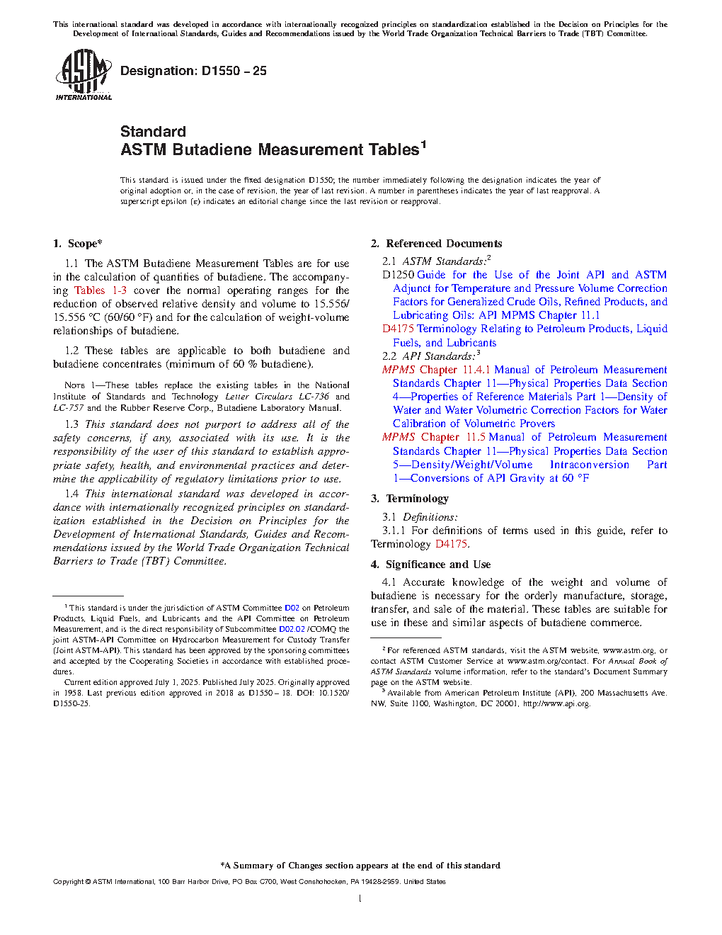 1.1 The ASTM Butadiene Measurement Tables are for use in the calculation of quantities of butadiene. The accompanying Tables 1-3 cover the normal operating ranges for the reduction of observed relative density and volume to 15.556/15.556 °C (60/60 °F) and for the calculation of weight-volume relationships of butadiene.
