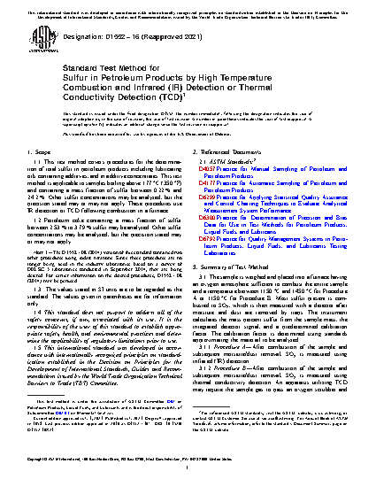1.1 This test method covers a procedure for the determination of total sulfur in petroleum products including lubricating oils containing additives, and in additive concentrates. This test method is applicable to samples boiling above 177 °C (350 °F) and containing a mass fraction of sulfur not less than 0.06 %. This procedure uses IR detection following pyrolysis in a resistance furnace.