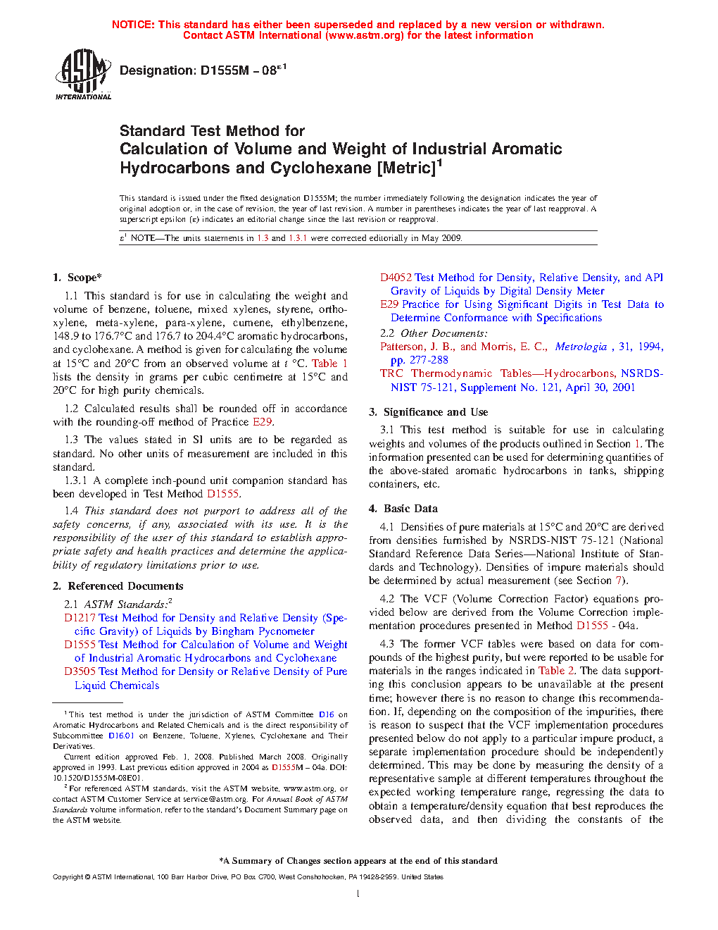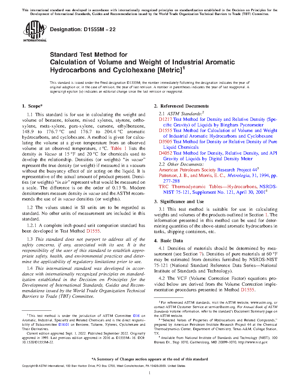 1.1 This standard is for use in calculating the weight and volume of benzene, toluene, mixed xylenes, styrene, ortho-xylene, meta-xylene, para-xylene, cumene, ethylbenzene, 148.9 to 176.7 °C and 176.7 to 204.4 °C aromatic hydrocarbons, and cyclohexane. A method is given for calculating the volume at a given temperature from an observed volume at an observed temperature, t °C. Table 1 lists the density in Vacuo at 15 °F and 20 °C for chemicals used to develop the relationship. Densities (or weights) “in vacuo” represent the true density (or weight) if measured in a vacuum without the buoyancy effect of air acting on the liquid. It is representative of the actual amount of product present. Densities (or weights) “in air” represent what would be measured on a scale. The difference is on the order of 0.13 %. Modern densitometers measure density in vacuo and the ASTM recommends the use of in vacuo densities (or weights).