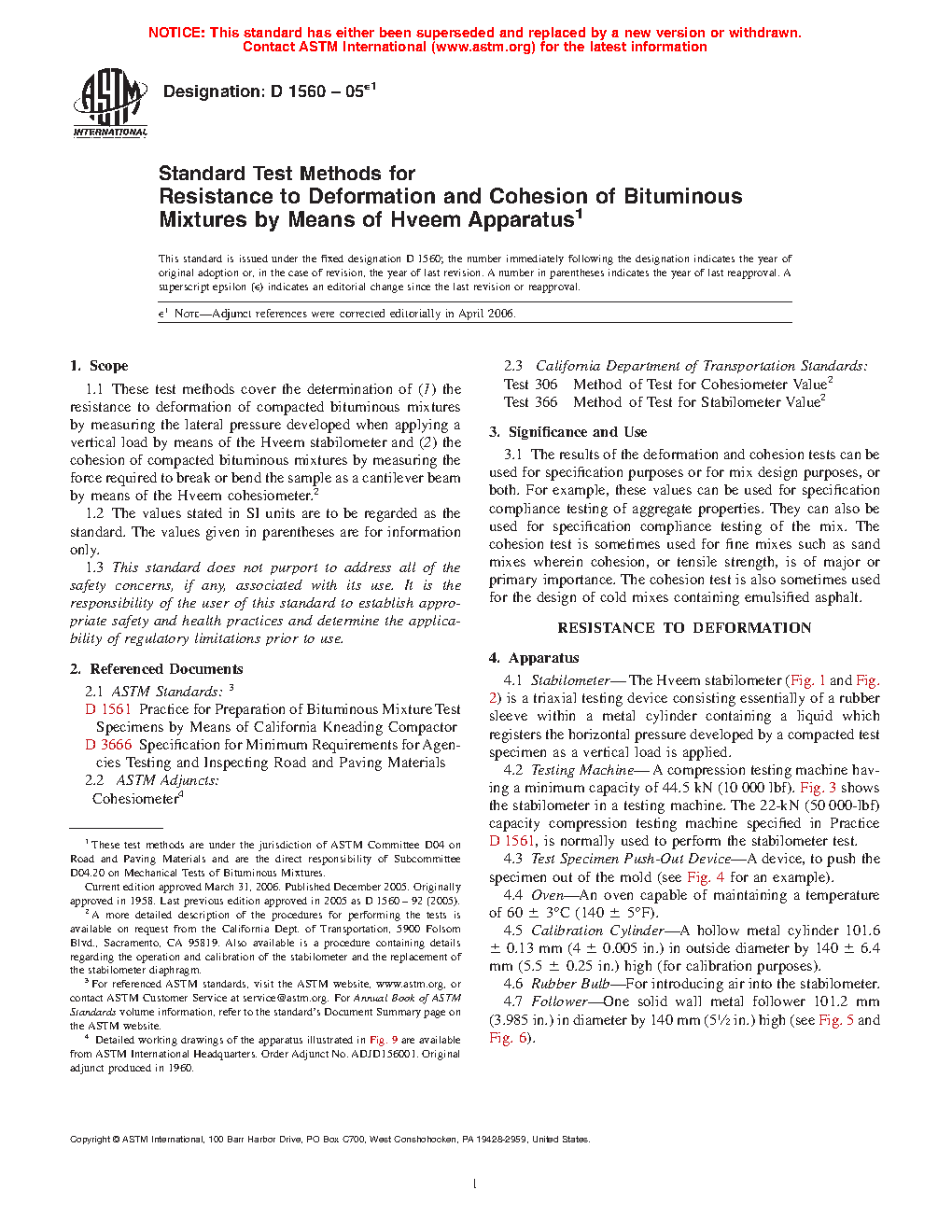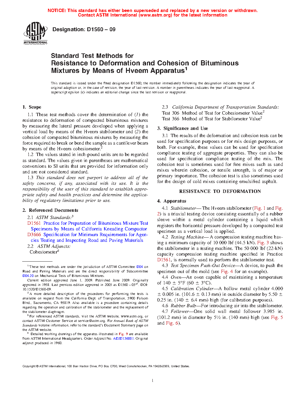 1.1 These test methods cover the determination of (1) the resistance to deformation of compacted bituminous mixtures by measuring the lateral pressure developed when applying a vertical load by means of the Hveem stabilometer and (2) the cohesion of compacted bituminous mixtures by measuring the force required to break or bend the sample as a cantilever beam by means of the Hveem cohesiometer.²