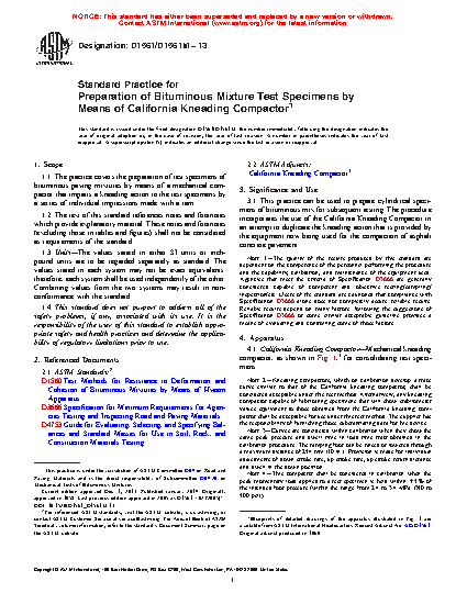 1.1 The practice covers the preparation of test specimens of bituminous paving mixtures by means of a mechanical compactor that imparts a kneading action to the test specimens by a series of individual impressions made with a ram.