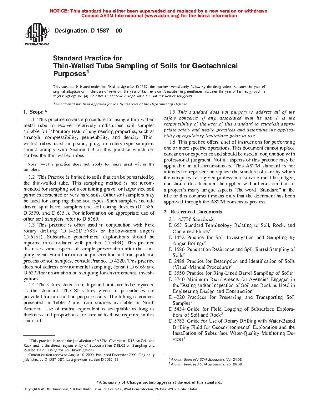 1.3 This practice is often used in conjunction with fluid rotary drilling (D1452, D5783) or hollow-stem augers (D6151). Subsurface geotechnical explorations should be reported in accordance with practice (D5434). This practice discusses some aspects of sample preservation after the sampling event. For information on preservation and transportation process of soil samples, consult Practice D4220. This practice does not address environmental sampling; consult D6169 and D6232 for information on sampling for environmental investigations.