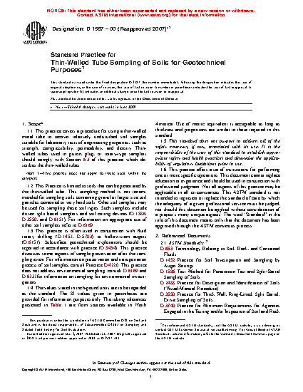1.1 This practice covers a procedure for using a thin-walled metal tube to recover relatively intact soil samples suitable for laboratory tests of engineering properties, such as strength, compressibility, permeability, and density. Thin-walled tubes used in piston, plug, or rotary-type samplers should comply with Section 6.3 of this practice which describes the thin-walled tubes.