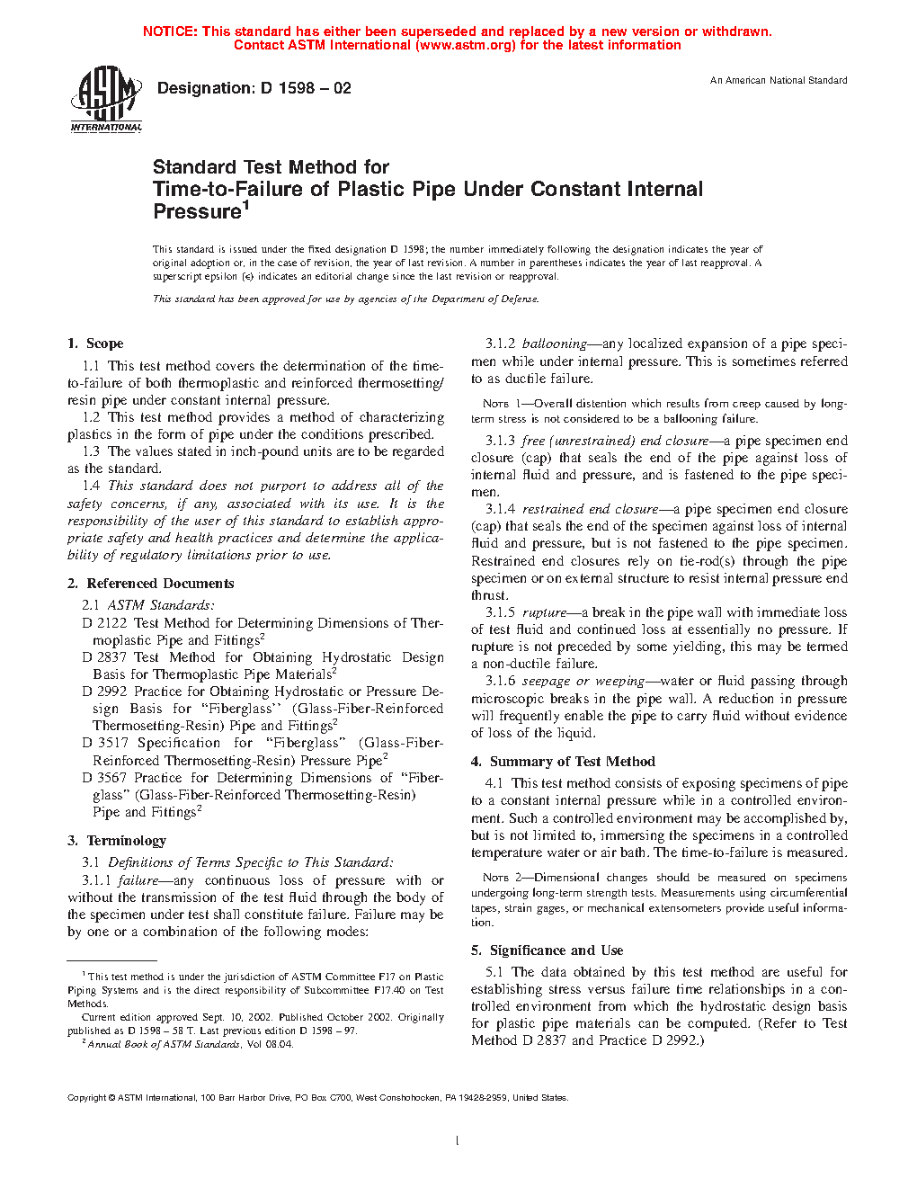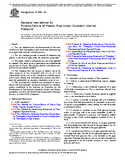 1.1 This test method covers the determination of the time-to-failure of both thermoplastic and reinforced thermosetting/resin pipe under constant internal pressure.