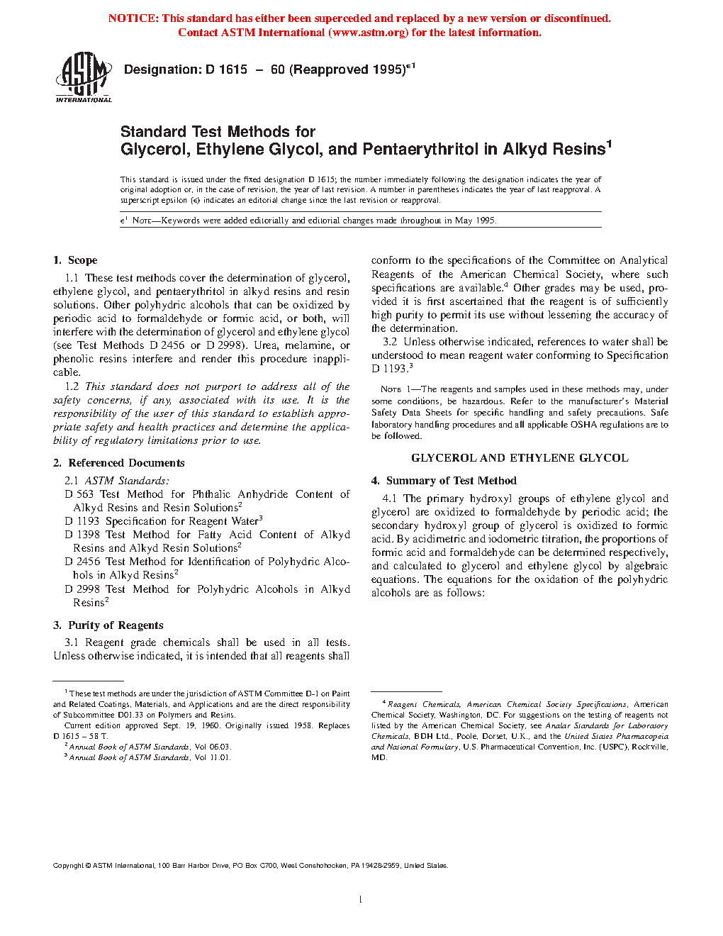 Standard Test Methods for Glycerol, Ethylene Glycol, and Pentaerythritol in Alkyd Resins (Withdrawn 2004)