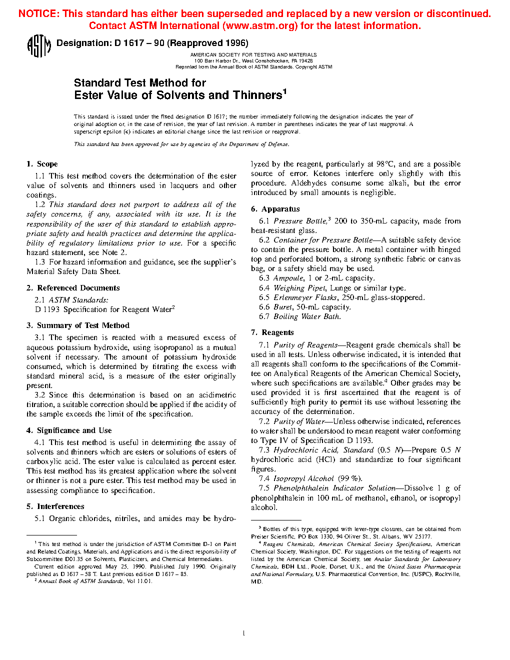 4.1 This test method is useful in determining the assay of solvents and thinners which are esters or solutions of esters of carboxylic acid. The ester value is calculated as percent ester. This test method has its greatest application where the solvent or thinner is not a pure ester. This test method may be used in assessing compliance to specification.