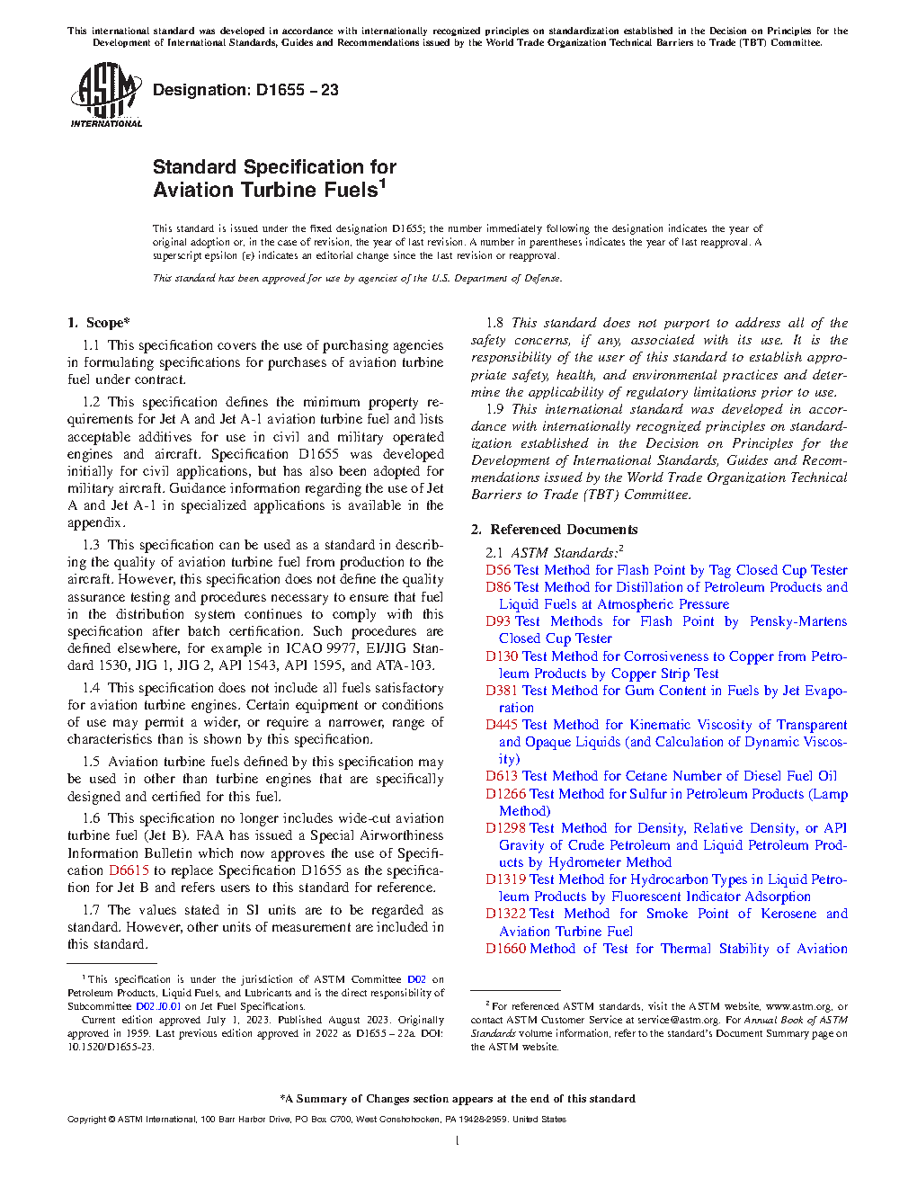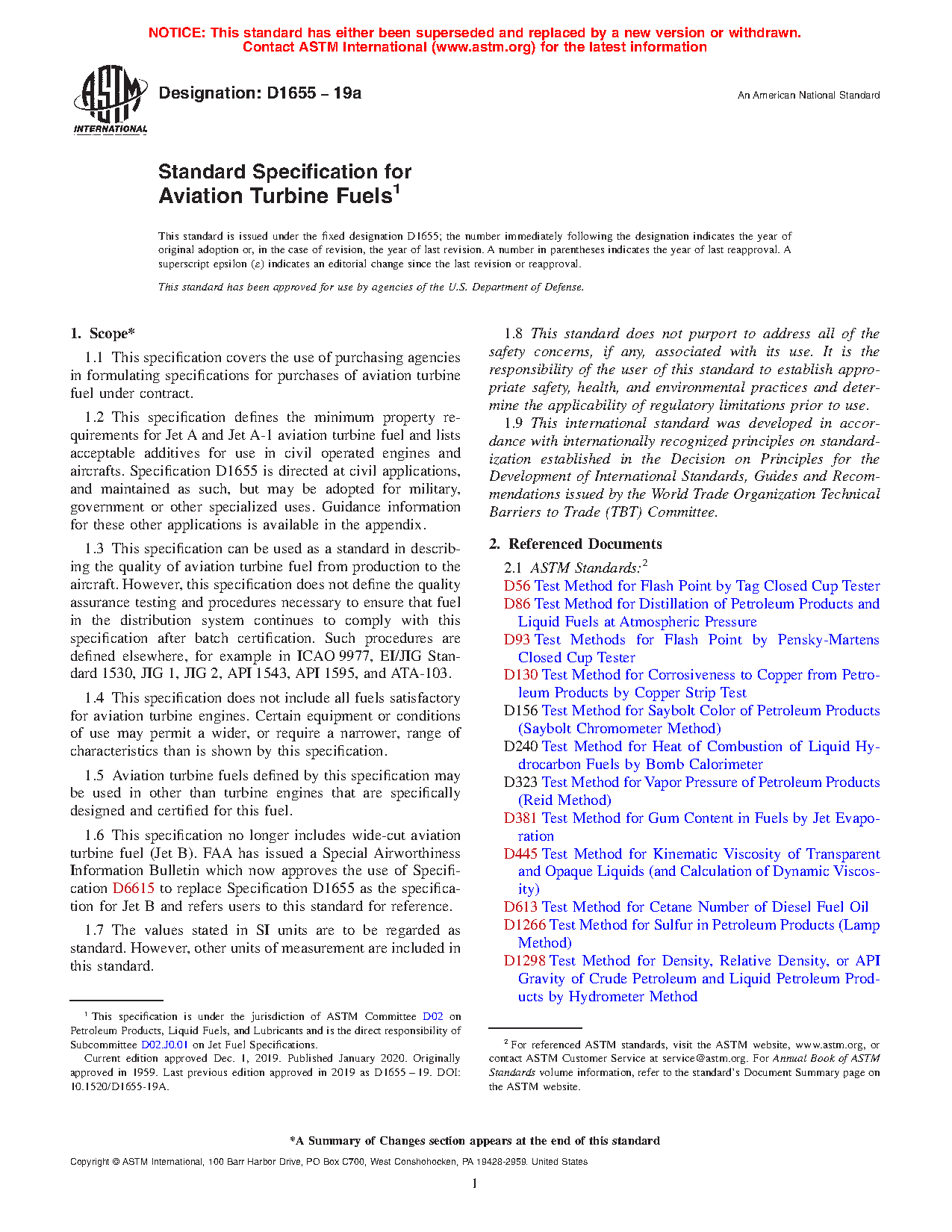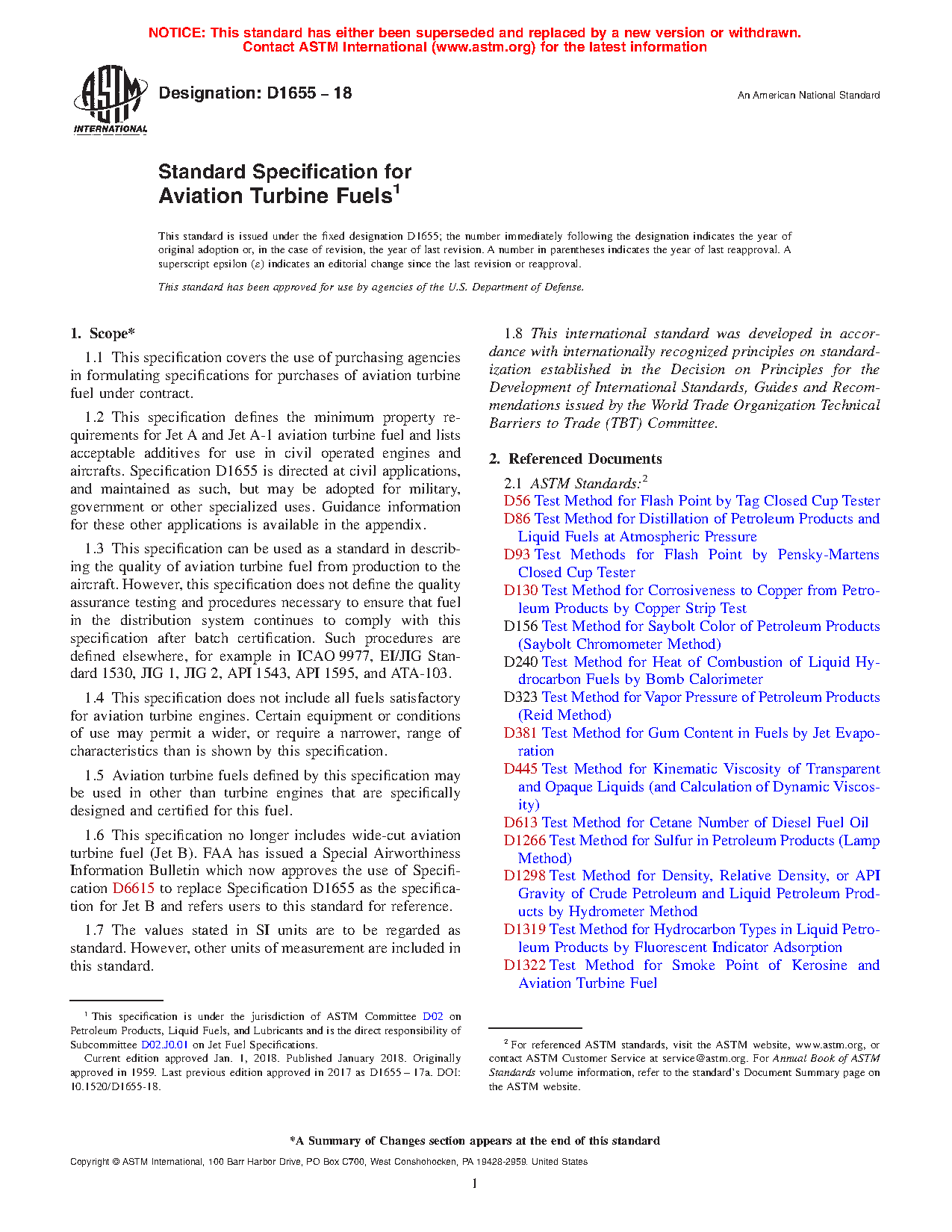 1.2 This specification defines the minimum property requirements for Jet A and Jet A-1 aviation turbine fuel and lists acceptable additives for use in civil and military operated engines and aircraft. Specification D1655 was developed initially for civil applications, but has also been adopted for military aircraft. Guidance information regarding the use of Jet A and Jet A-1 in specialized applications is available in the appendix.
