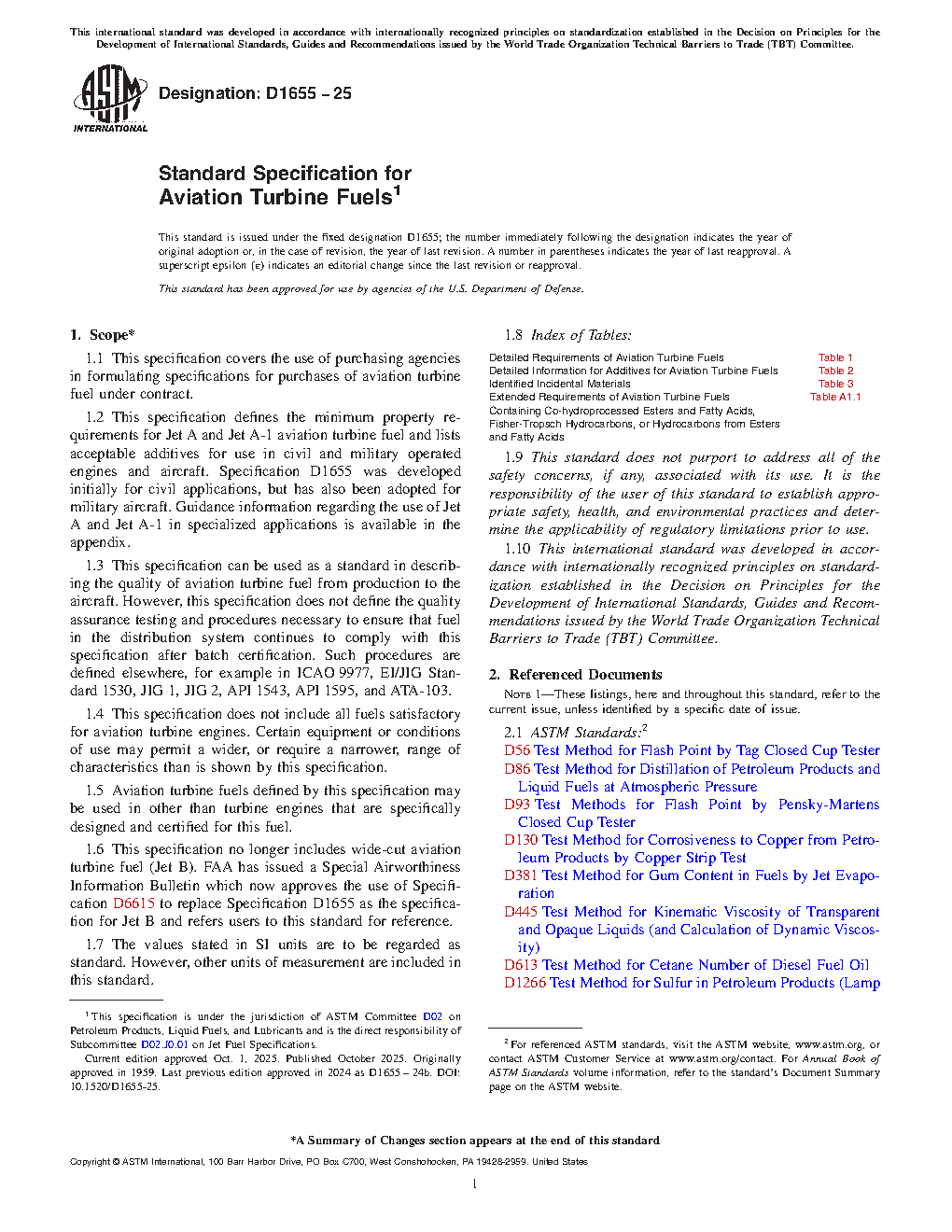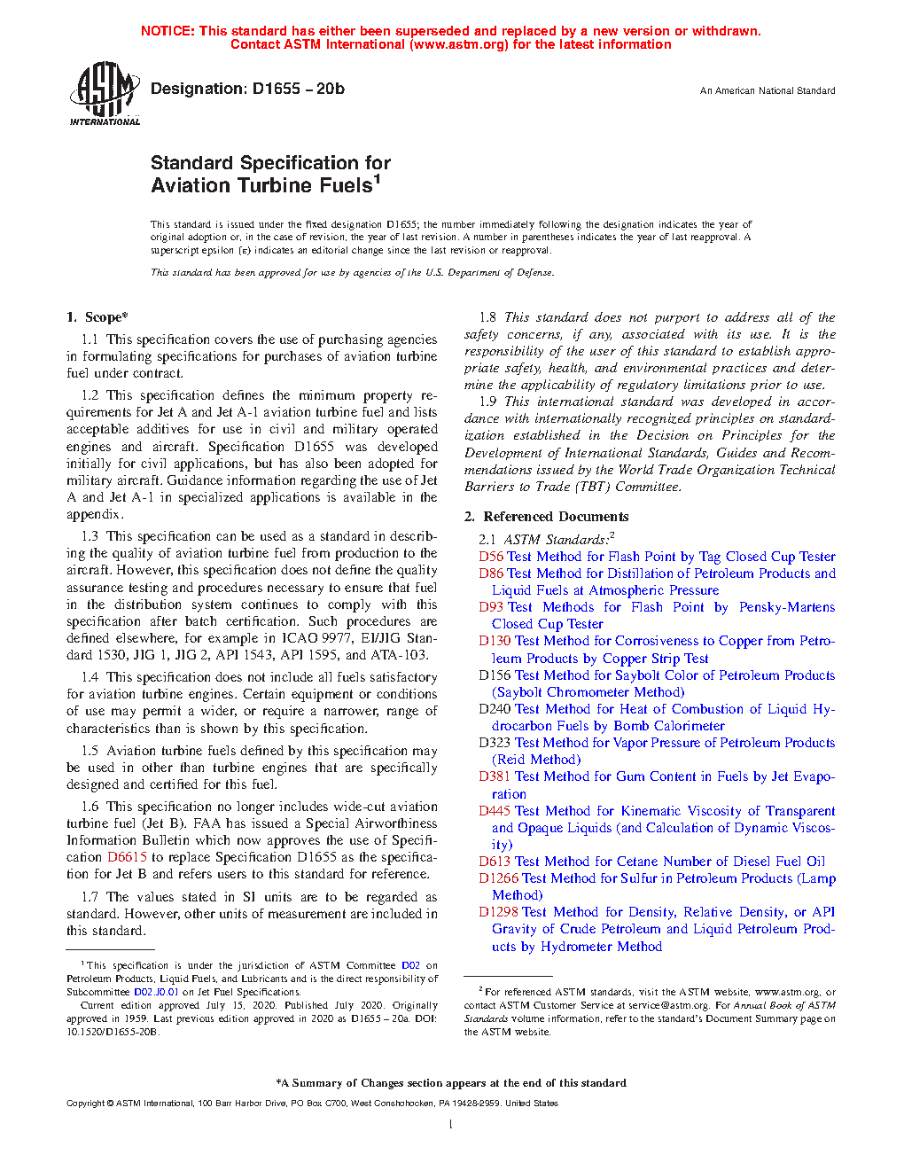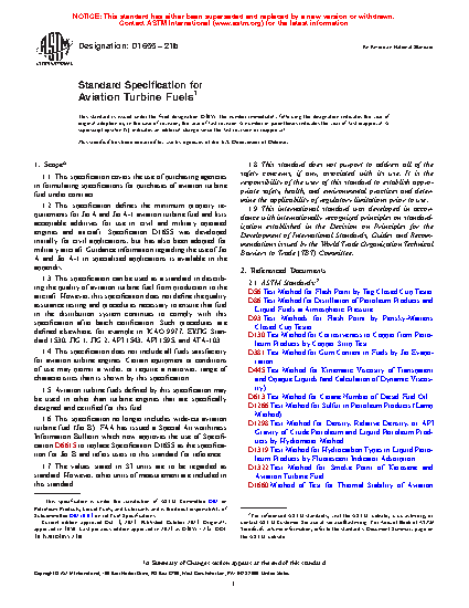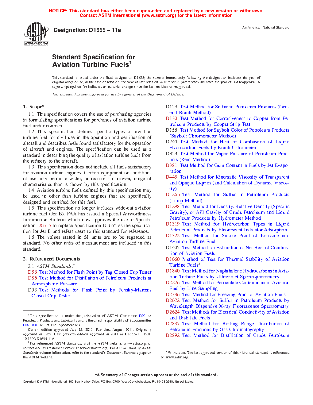 1.2 This specification defines the minimum property requirements for Jet A and Jet A-1 aviation turbine fuel and lists acceptable additives for use in civil and military operated engines and aircraft. Specification D1655 was developed initially for civil applications, but has also been adopted for military aircraft. Guidance information regarding the use of Jet A and Jet A-1 in specialized applications is available in the appendix.