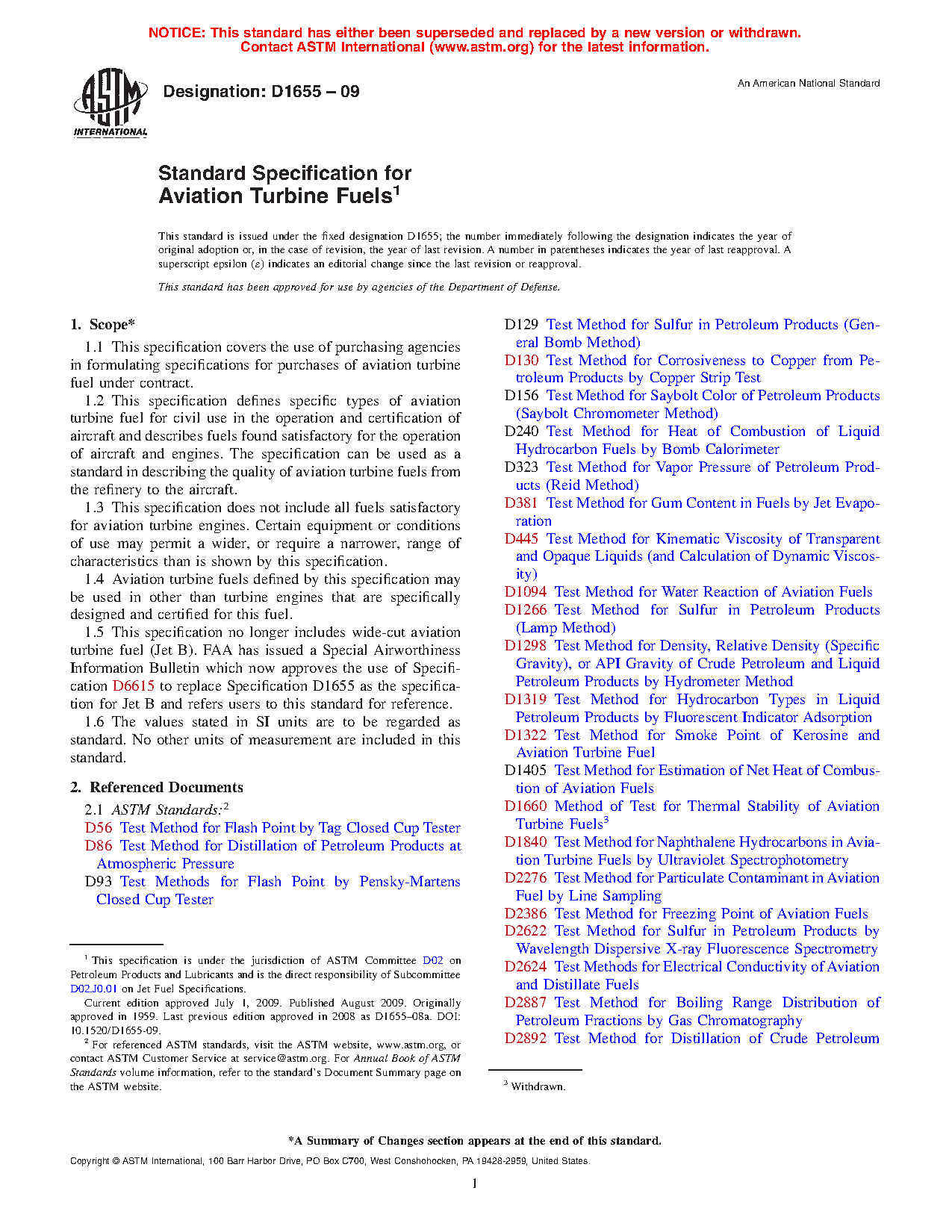 1.6 This specification no longer includes wide-cut aviation turbine fuel (Jet B). FAA has issued a Special Airworthiness Information Bulletin which now approves the use of Specification D6615 to replace Specification D1655 as the specification for Jet B and refers users to this standard for reference.