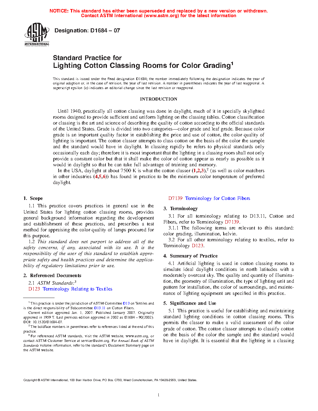 1.1 This practice covers practices in general use in the United States for lighting cotton classing rooms, provides general background information regarding the development and establishment of these practices, and prescribes a method of test for appraising the color quality of lamps procured for this purpose.