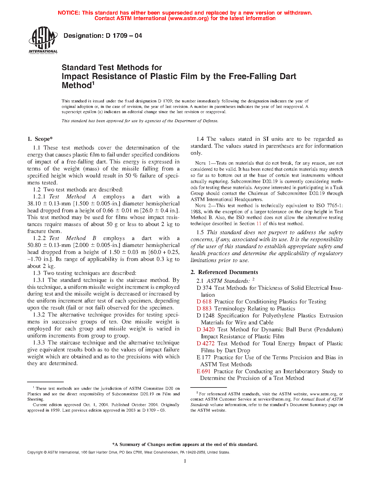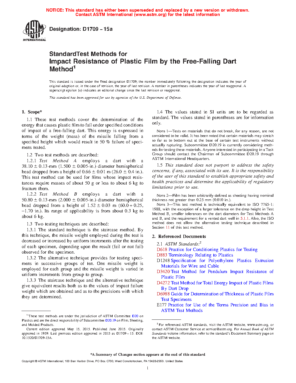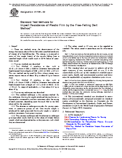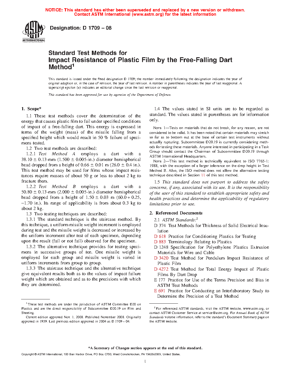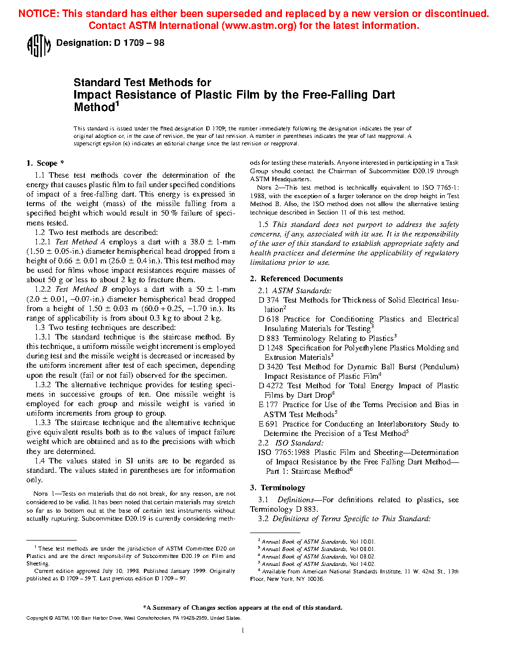 Note 2—This test method is technically equivalent to ISO 7765-1: 1988, with the exception of a larger tolerance on the drop height in Test Method B. Also, the ISO method does not allow the alternative testing technique described in Section of this test method.