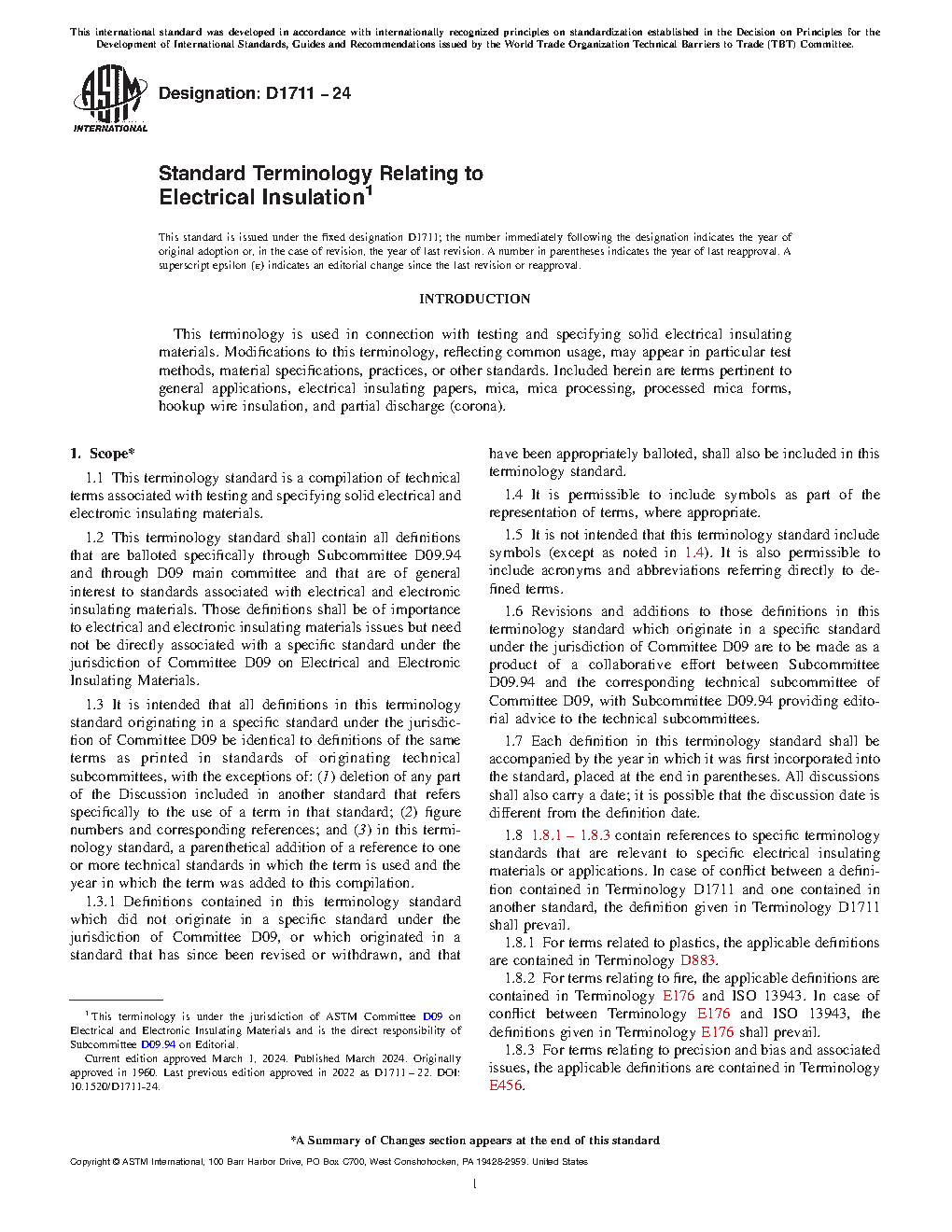 1.8 1.8.1 – 1.8.3 contain references to specific terminology standards that are relevant to specific electrical insulating materials or applications. In case of conflict between a definition contained in Terminology D1711 and one contained in another standard, the definition given in Terminology D1711 shall prevail.