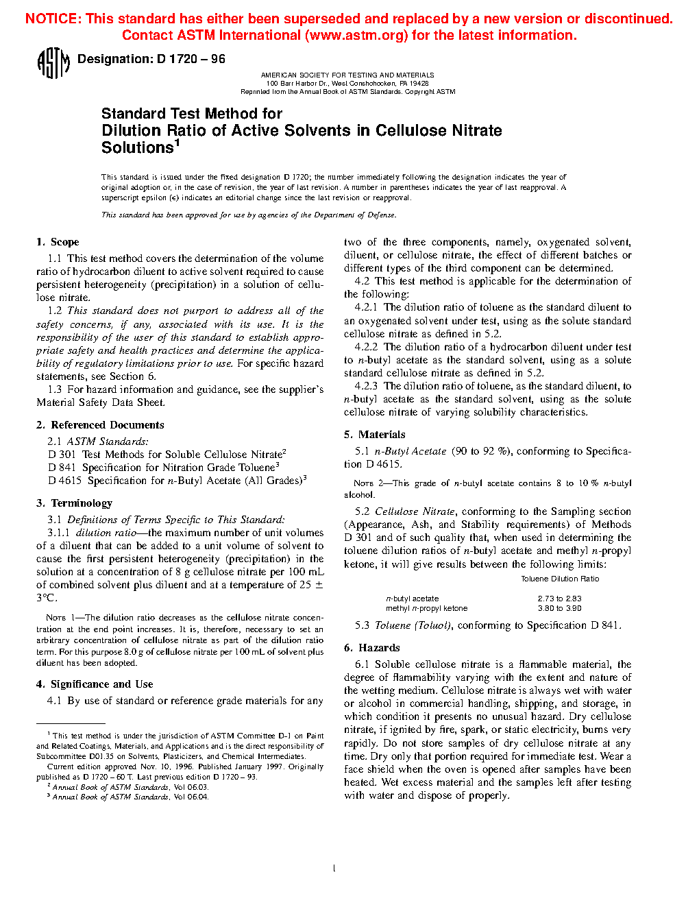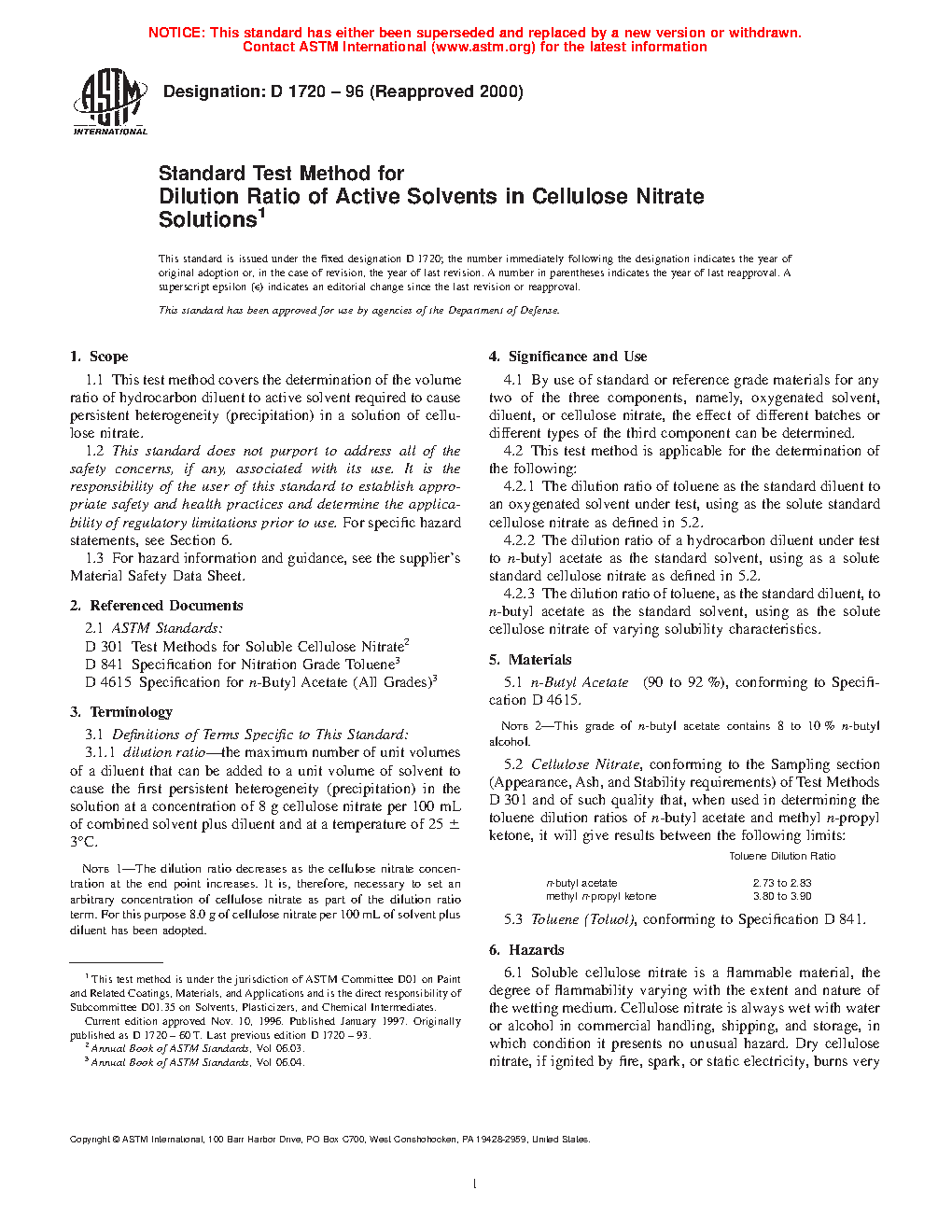 1.1 This test method covers the determination of the volume ratio of hydrocarbon diluent to active solvent required to cause persistent heterogeneity (precipitation) in a solution of cellulose nitrate.