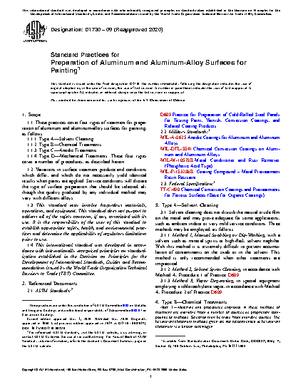 1.1 These practices cover four types of treatment for preparation of aluminum and aluminum-alloy surfaces for painting, as follows: