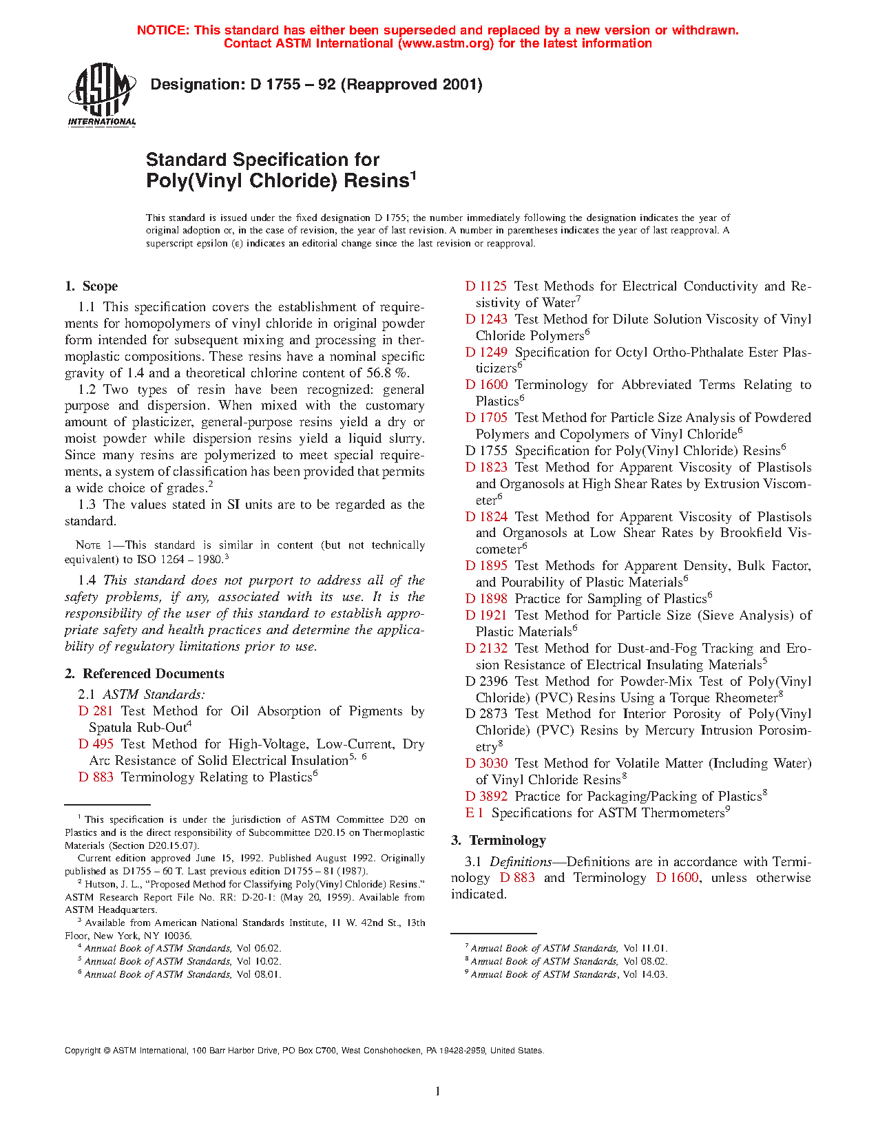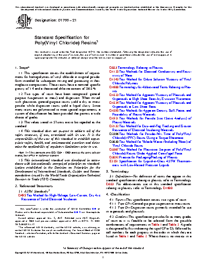 1.1 This specification covers the establishment of requirements for homopolymers of vinyl chloride in original powder form intended for subsequent mixing and processing in thermoplastic compositions. These resins have a nominal specific gravity of 1.4 and a theoretical chlorine content of 56.8 %.