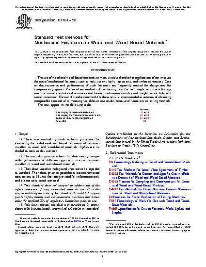 1.3 This test method covers the determination of the resistance to lateral movement offered by a single nail, staple, or screw in wood members. The test provides comparative data for various species of wood. This general test method can also be used for evaluating other types and sizes of fastenings either in wood or other building materials such as plywood, hardboard, etc., or combinations of materials. Furthermore, where required for specific purposes, the general method can be used for evaluating the lateral resistance of sizes of nails, staples, and screws other than those specified, and joints employing two or more fasteners. It is recommended that when such tests are made, the specified procedure be followed as closely as possible and all deviations be completely described.