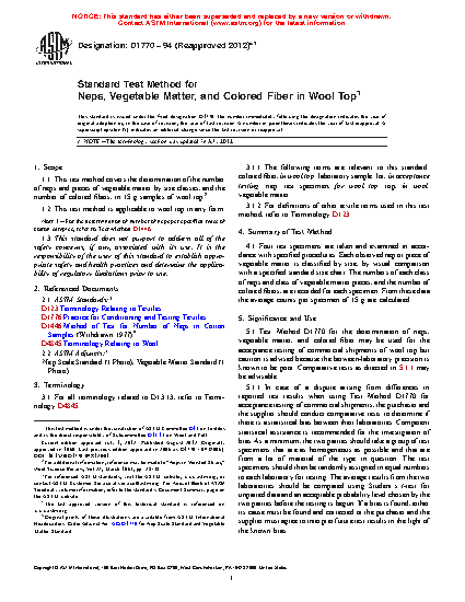 Test Method D1770 for the determination of neps, vegetable matter, and colored fiber may be used for the acceptance testing of commercial shipments of wool top but caution is advised because the between-laboratory precision is known to be poor. Comparative tests as directed in 5.1.1 may be advisable.