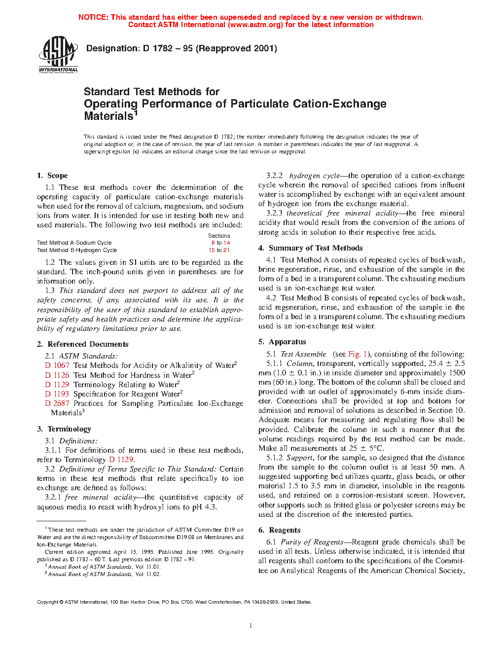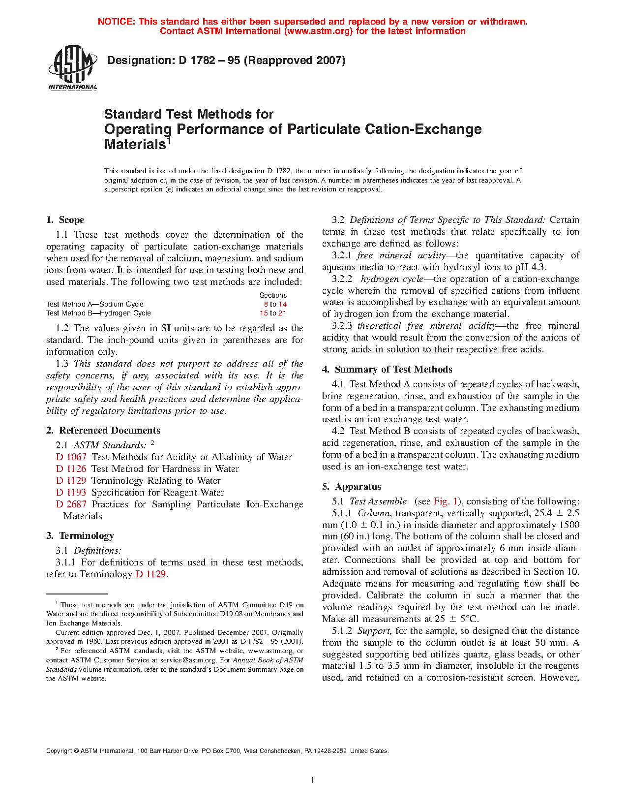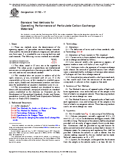 1.1 These test methods cover the determination of the operating capacity of particulate cation-exchange materials when used for the removal of calcium, magnesium, and sodium ions from water. It is intended for use in testing both new and used materials. The following two test methods are included: