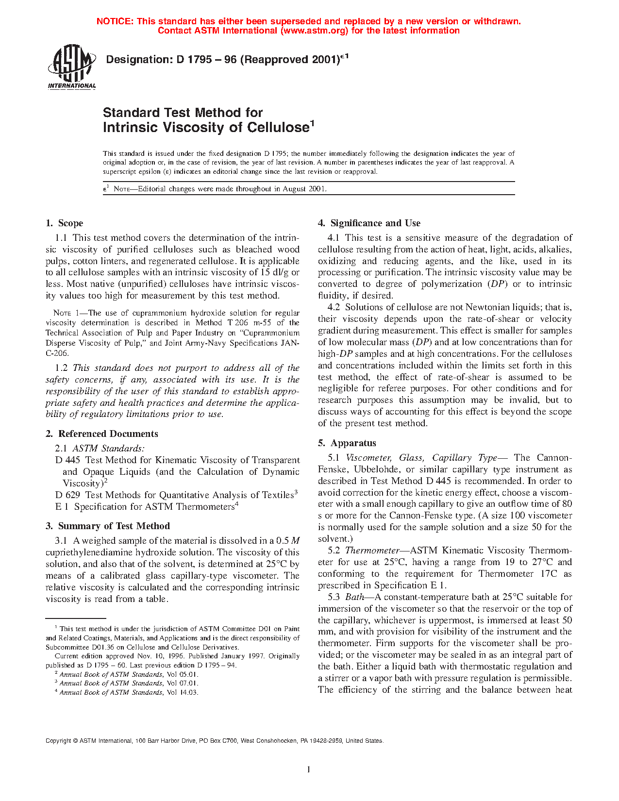 1.1 This test method covers the determination of the intrinsic viscosity of purified celluloses such as bleached wood pulps, cotton linters, and regenerated cellulose. It is applicable to all cellulose samples with an intrinsic viscosity of 15 dl/g or less. Most native (unpurified) celluloses have intrinsic viscosity values too high for measurement by this test method.