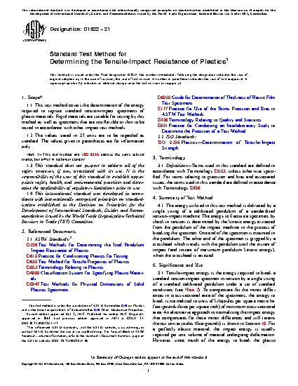 1.1 This test method covers the determination of the energy required to rupture standard tension-impact specimens of plastic materials. Rigid materials are suitable for testing by this method as well as specimens that are too flexible or thin to be tested in accordance with other impact test methods.