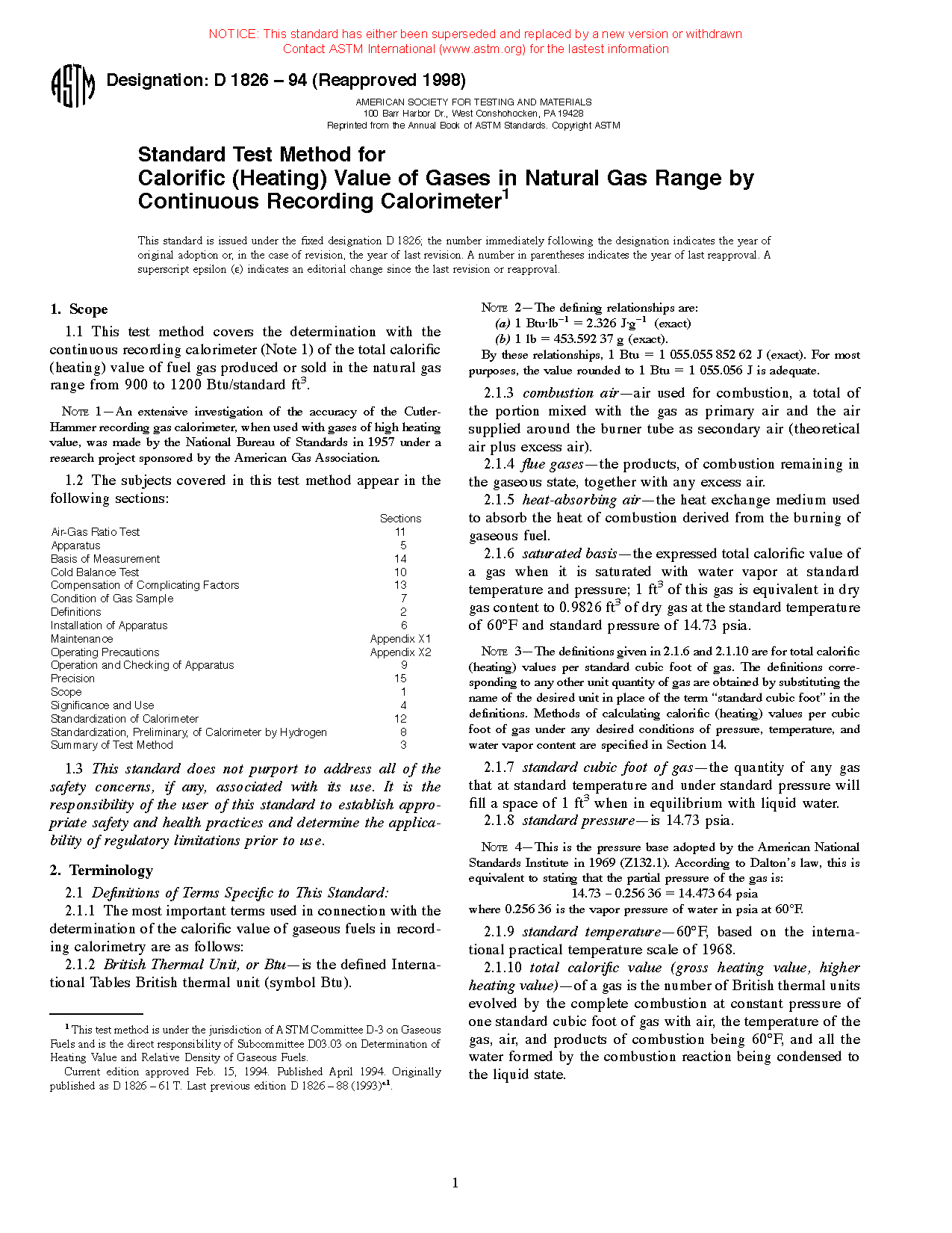 1.1 This test method covers the determination with the continuous recording calorimeter of the total calorific (heating) value of fuel gas produced or sold in the natural gas range from 900 to 1200 Btu/standard ft3 (33.5 to 44.7 MJ/m3).