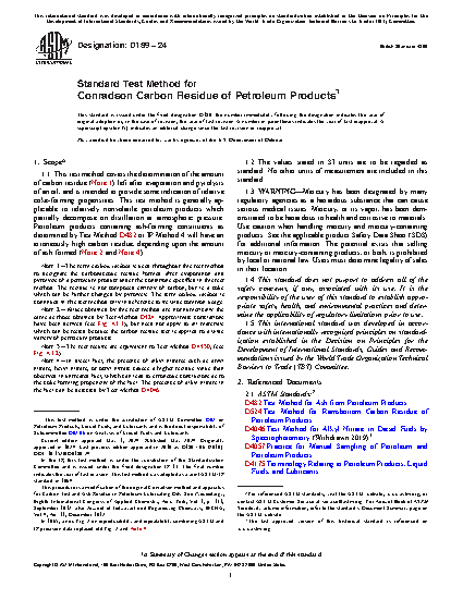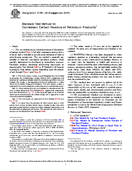1.1 This test method covers the determination of the amount of carbon residue (Note 1) left after evaporation and pyrolysis of an oil, and is intended to provide some indication of relative coke-forming propensities. This test method is generally applicable to relatively nonvolatile petroleum products which partially decompose on distillation at atmospheric pressure. Petroleum products containing ash-forming constituents as determined by Test Method D 482 Note 1—The term carbon residue is used throughout this test method to designate the carbonaceous residue formed after evaporation and pyrolysis of a petroleum product under the conditions specified in this test method. The residue is not composed entirely of carbon, but is a coke which can be further changed by pyrolysis. The term carbon residue is continued in this test method only in deference to its wide common usage. Note 2—Values obtained by this test method are not numerically the same as those obtained by Test Method D 524 Note 3—The test results are equivalent to Test Method D 4530 Note 4—In diesel fuel, the presence of alkyl nitrates such as amyl nitrate, hexyl nitrate, or octyl nitrate causes a higher residue value than observed in untreated fuel, which can lead to erroneous conclusions as to the coke forming propensity of the fuel. The presence of alkyl nitrate in the fuel can be detected by Test Method D 4046
