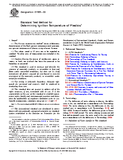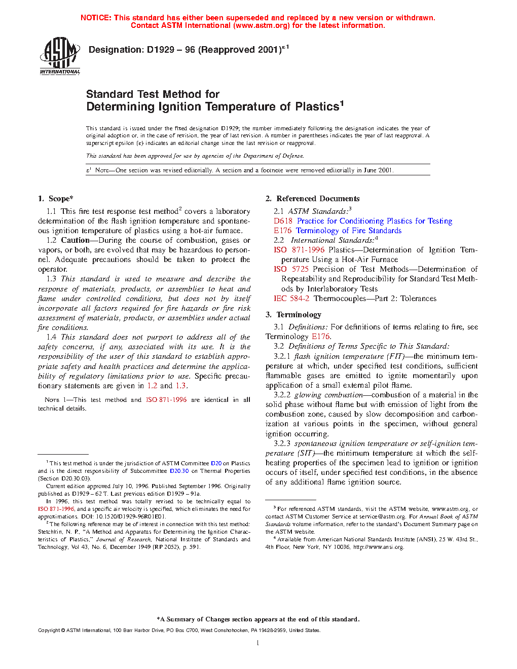 1.1 This fire test response test method² covers a laboratory determination of the flash ignition temperature and spontaneous ignition temperature of plastics using a hot-air furnace.