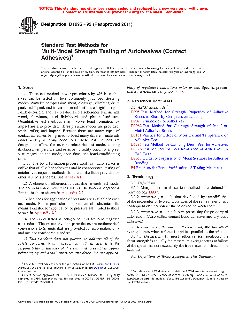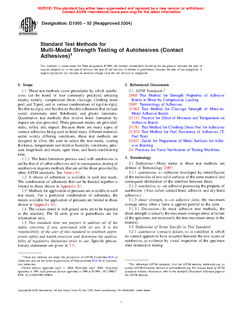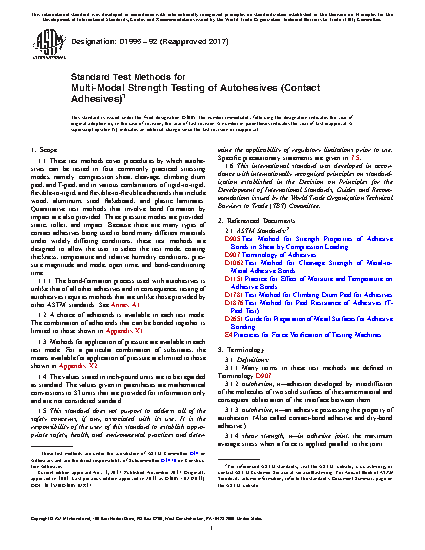 1.1 These test methods cover procedures by which autohesives can be tested in four commonly practiced stressing modes, namely: compression shear, cleavage, climbing drum peel, and T-peel, and in various combinations of rigid-to-rigid, flexible-to-rigid, and flexible-to-flexible adherends that include wood, aluminum, steel flakeboard, and plastic laminates. Quantitative test methods that involve bond formation by impact are also provided. Three pressure modes are provided: static, roller, and impact. Because there are many types of contact adhesives being used to bond many different materials under widely differing conditions, these test methods are designed to allow the user to select the test mode, coating thickness, temperature and relative humidity conditions, pressure magnitude and mode, open time, and bond-conditioning time.