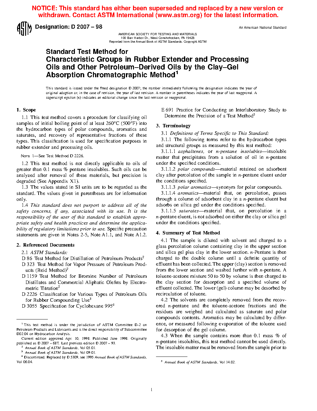1.1 This test method covers a procedure for classifying oil samples of initial boiling point of at least 260 °C (500 °F) into the hydrocarbon types of polar compounds, aromatics and saturates, and recovery of representative fractions of these types. This classification is used for specification purposes in rubber extender and processing oils.