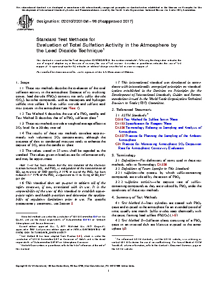 1.1 These test methods describe the evaluation of the total sulfation activity in the atmosphere. Because of its oxidizing power, lead dioxide (PbO2) converts not only sulfur dioxide (SO2), but other compounds, such as mercaptans and hydrogen sulfide, into sulfate. It fixes sulfur trioxide and sulfuric acid mist present in the atmosphere (see Note 1).