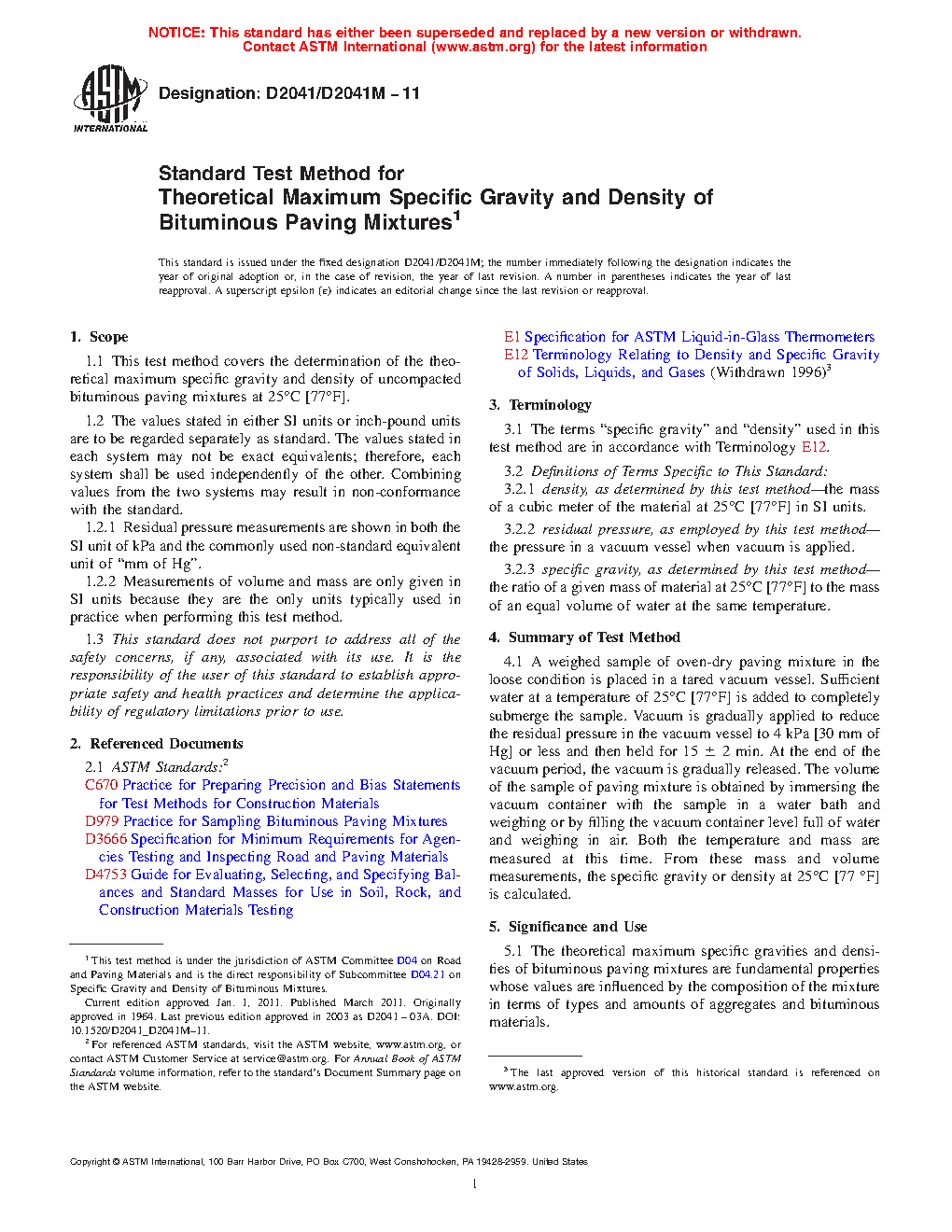 1.1 This test method covers the determination of the theoretical maximum specific gravity and density of uncompacted asphalt mixtures at 25 °C [77 °F].