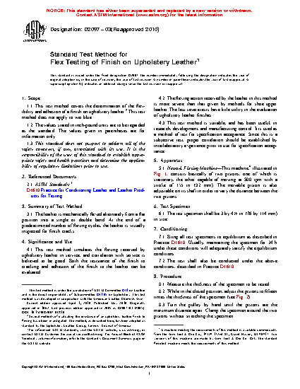 4.1 This test method simulates the flexing received by upholstery leather in service, and correlation with service is believed to be good. Both the resistance of the finish to cracking and adhesion of the finish to the leather can be evaluated.