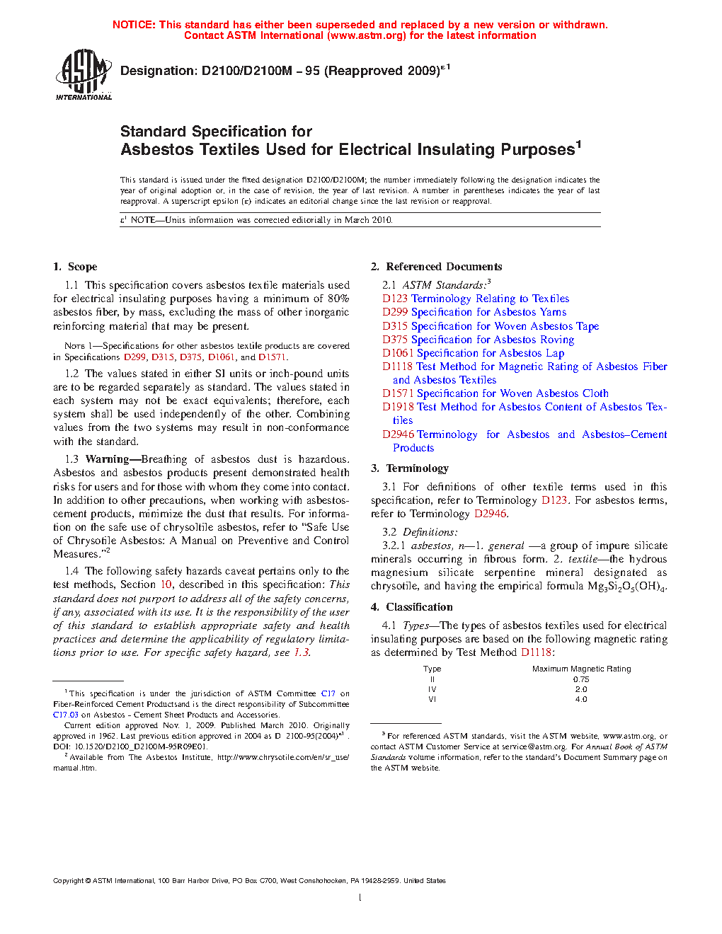 This specification covers asbestos textile materials used for electrical insulating purposes having a specified minimum mass % of asbestos fiber, excluding the mass of other inorganic reinforcing material that may be present. Asbestos textiles are classified into three types (Types II, IV, and VI) according to magnetic rating, and into grades (Underwriters, A, AA, AAA, and AAAA) according to the percentage of asbestos content by mass. Textile materials shall meet chemical composition (asbestos content) and magnetic rating specific to their grade and type.