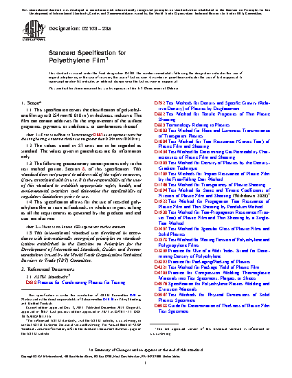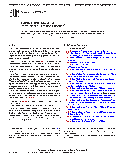 This specification covers the classification of polyethylene film and sheeting. Recycled polyethylene film or resin may be used as feedstock, and the film or sheeting may contain additives for surface property improvement, pigments, or stabilizers, or a combination of these, but they must conform to the requirements specified. Material covered in this specification shall be designated by a five-digit type number, with each numeral (from 0 to 5) indicating the cell limit within which the values of the density, impact strength, kinetic coefficient of friction, haze, and nominal thickness of the material falls under. The sheet or film shall be manufactured free, as commercially possible, of gels, streaks, pinholes, particles of foreign matter, and undispersed raw material, and without any other visible defects such as holes, tears, or blisters. The edges of the sheet or film shall be free of nicks and cuts. The surface of the sheet or film may also be treated by flame, corona discharge, or other means to improve the surface properties. Tests to determine the density, impact strength, kinetic coefficient of friction, haze, and nominal thickness of the material shall be performed and shall conform to the requirements specified.