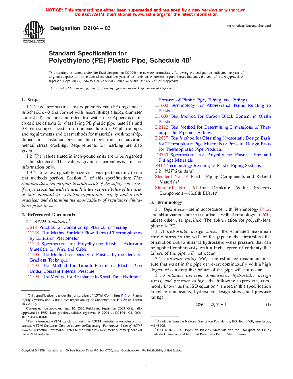 This specification covers polyethylene (PE) plastic pipe made in schedule 40 size for use with insert fittings and pressure-rated for water. Polyethylene plastics shall meet the requirements as defined by short-term and long-term strength tests, hydrostatic design stresses, PE plastic extrusion compound, and rework material. This specification also includes classification criteria, nomenclature system, test methods, requirements, workmanship, dimensions, carbon black content, bond strength, sustained pressure, density, burst pressure, and environmental stress cracking. Test methods shall include conditioning, sampling, density, sustained pressure test, environmental stress cracking test, elevated temperature test, and burst pressure test.