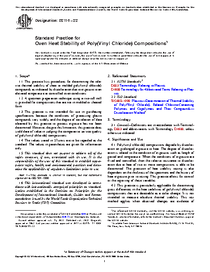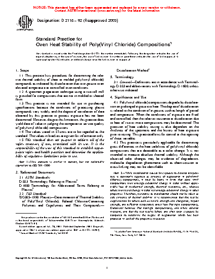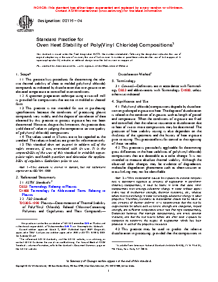 1.1 This practice lists procedures for determining the relative thermal stability of sheet or molded poly(vinyl chloride) compounds as indicated by discoloration due to exposure to an elevated temperature at controlled oven conditions.