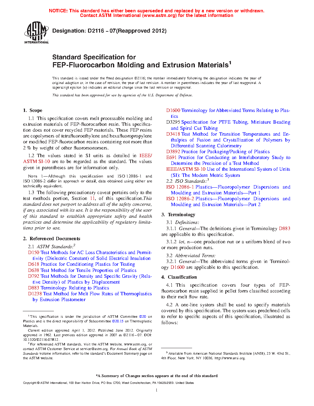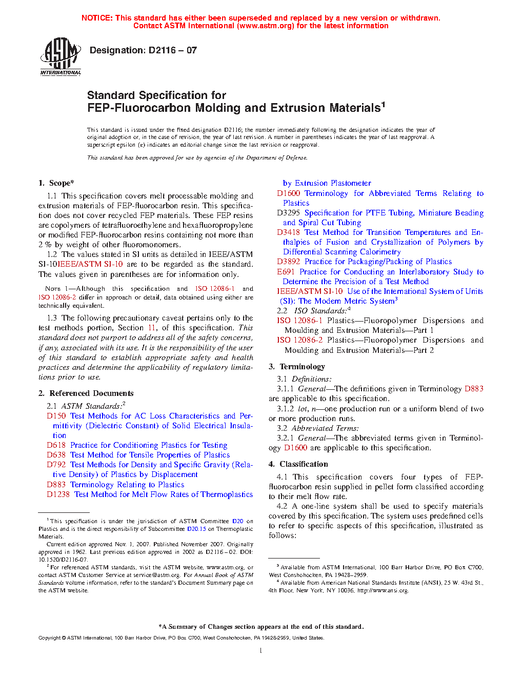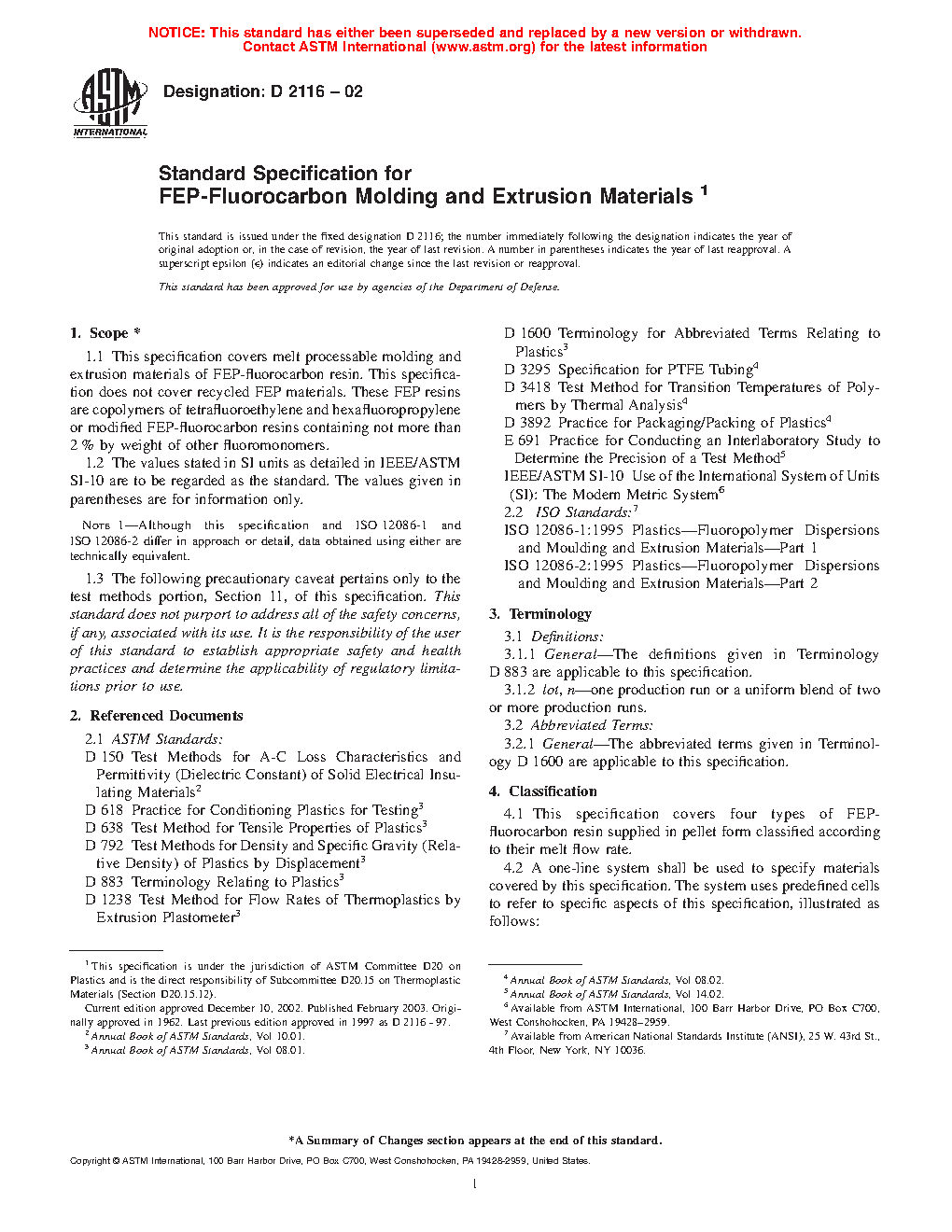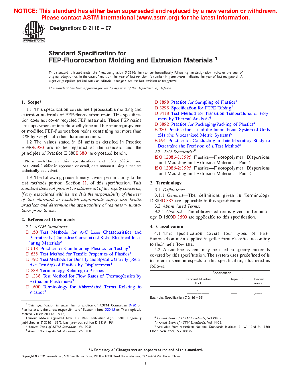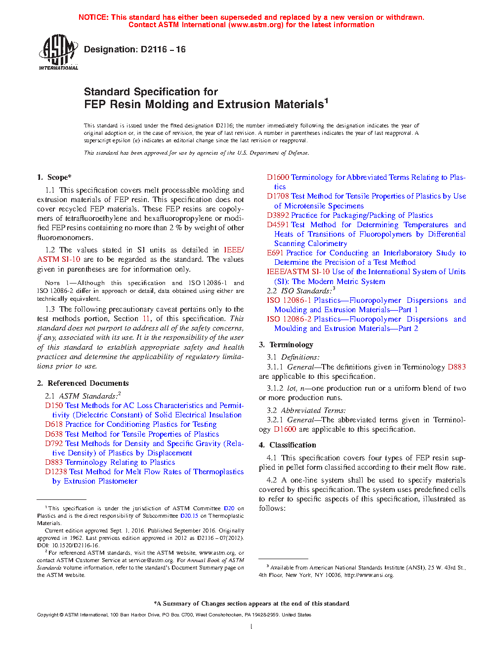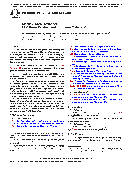 1.1 This specification covers melt processable molding and extrusion materials of FEP resin. This specification does not cover recycled FEP materials. These FEP resins are copolymers of tetrafluoroethylene and hexafluoropropylene or modified FEP resins containing no more than 2 % by weight of other fluoromonomers.