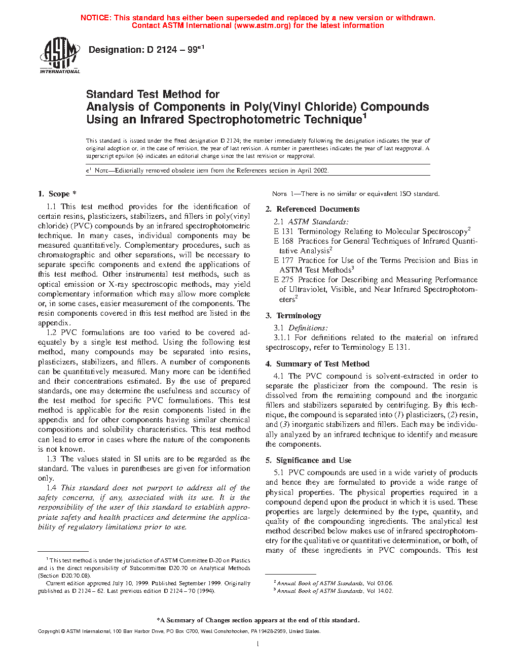 1.1 This test method provides for the identification of certain resins, plasticizers, stabilizers, and fillers in poly(vinyl chloride) (PVC) compounds by an infrared spectrophotometric technique. In many cases, individual components may be measured quantitatively. Complementary procedures, such as chromatographic and other separations, will be necessary to separate specific components and extend the applications of this test method. Other instrumental test methods, such as optical emission or X-ray spectroscopic methods, may yield complementary information which may allow more complete or, in some cases, easier measurement of the components. The resin components covered in this test method are listed in the appendix.