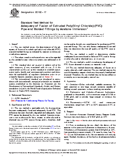1.1 This test method covers the determination of the adequacy of fusion of extruded rigid poly(vinyl chloride) (PVC) pipe and molded fittings as indicated by reaction to immersion in anhydrous acetone.