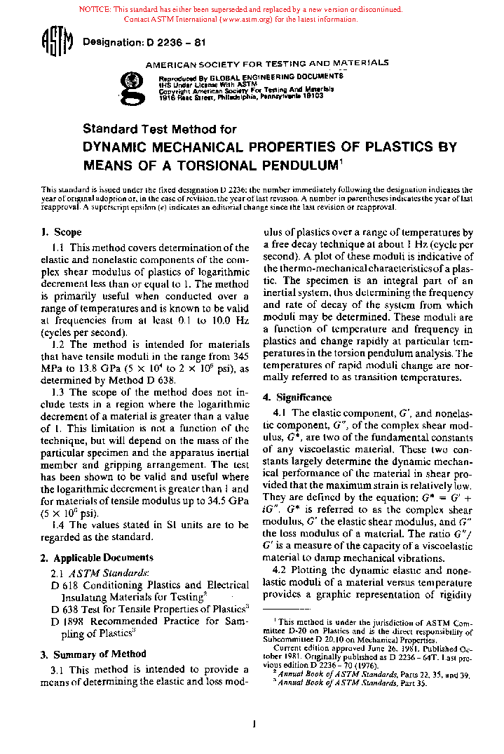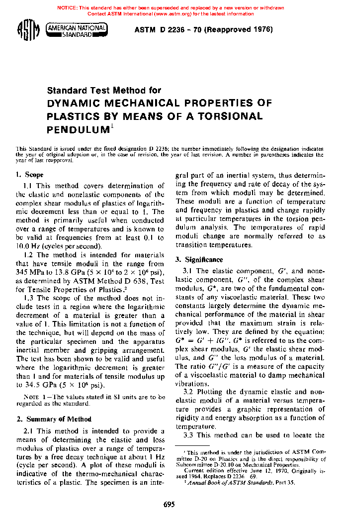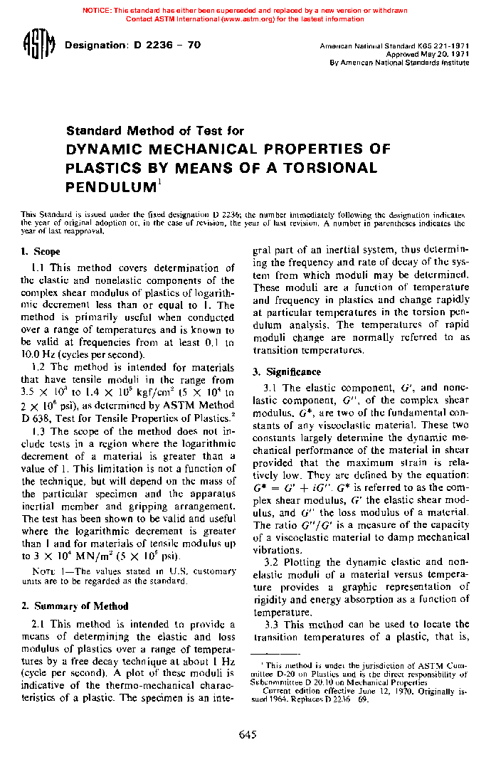 Method of Test for Dynamic Mechanical Properties of Plastics by Means of a Torsienal Pendulum (Withdrawn 1984)