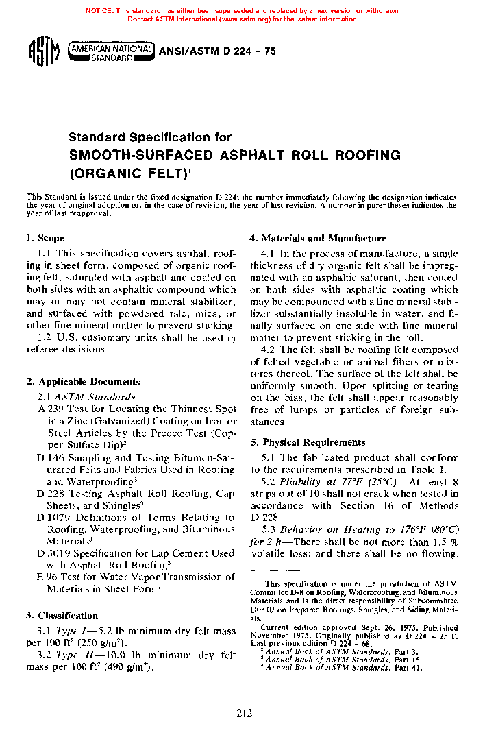 Standard Specification for Smooth-Surfaced Asphalt Roll Roofing (Organic Felt) (Withdrawn 2002)