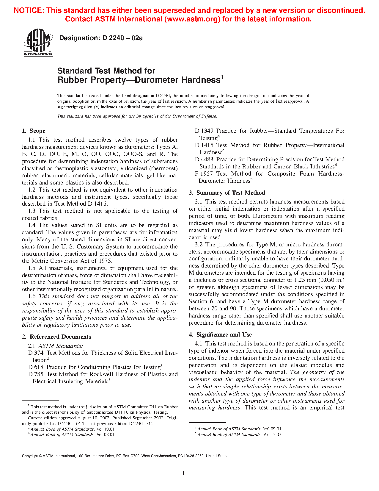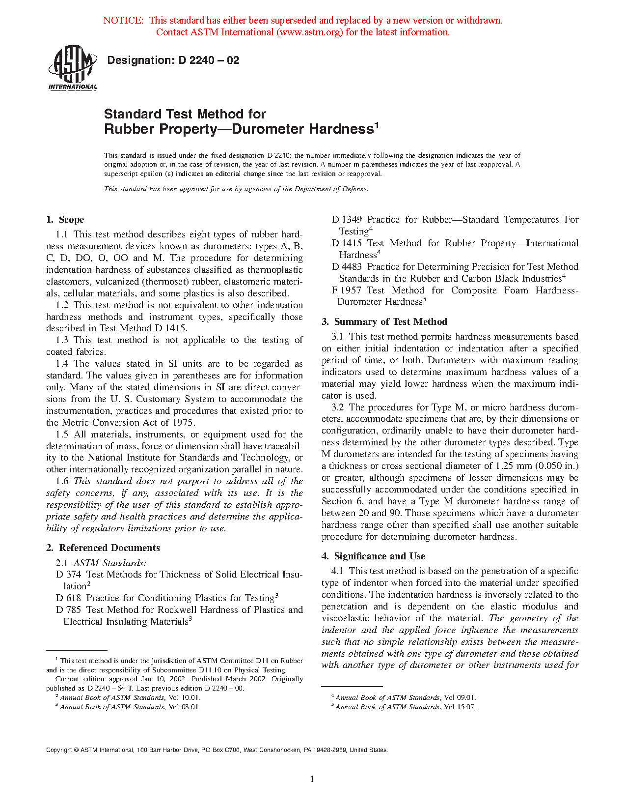 4.1 This test method is based on the penetration of a specific type of indentor when forced into the material under specified conditions. The indentation hardness is inversely related to the penetration and is dependent on the elastic modulus and viscoelastic behavior of the material. The geometry of the indentor and the applied force influence the measurements such that no simple relationship exists between the measurements obtained with one type of durometer and those obtained with another type of durometer or other instruments used for measuring hardness. This test method is an empirical test intended primarily for control purposes. No simple relationship exists between indentation hardness determined by this test method and any fundamental property of the material tested. For specification purposes, it is recommended that Test Method D785 be used for materials other than those described in 1.1.