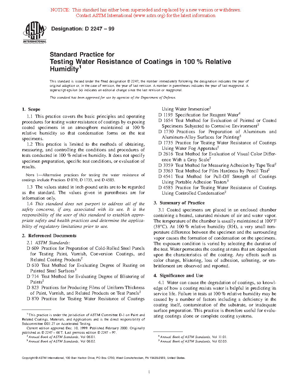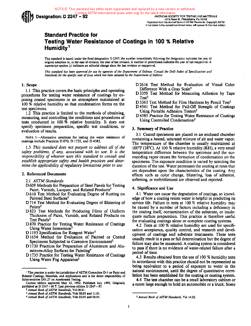 Note 1: Alternative practices for testing the water resistance of coatings include Practices D870, D1735, and D4585.