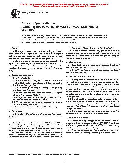 This specification covers asphalt roofing in shingle form, composed of single or multiple thicknesses of organic felt saturated and coated on both sides with asphalt and surfaced on the weather side with mineral granules. Materials shall meet specified dimensional and physical property requirements such as mass, behavior on heating (loss of volatile matter, and sliding of granular surfacing), wind resistance, fire resistance, weight of displaced granules, pliability, and saturant/coating compatibility.