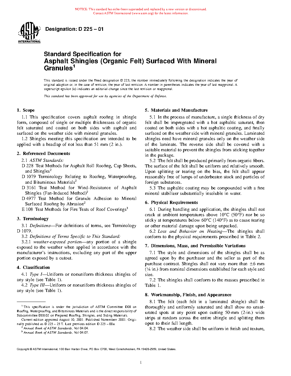 Standard Specification for Asphalt Shingles (Organic Felt) Surfaced With Mineral Granules (Withdrawn 2012)
