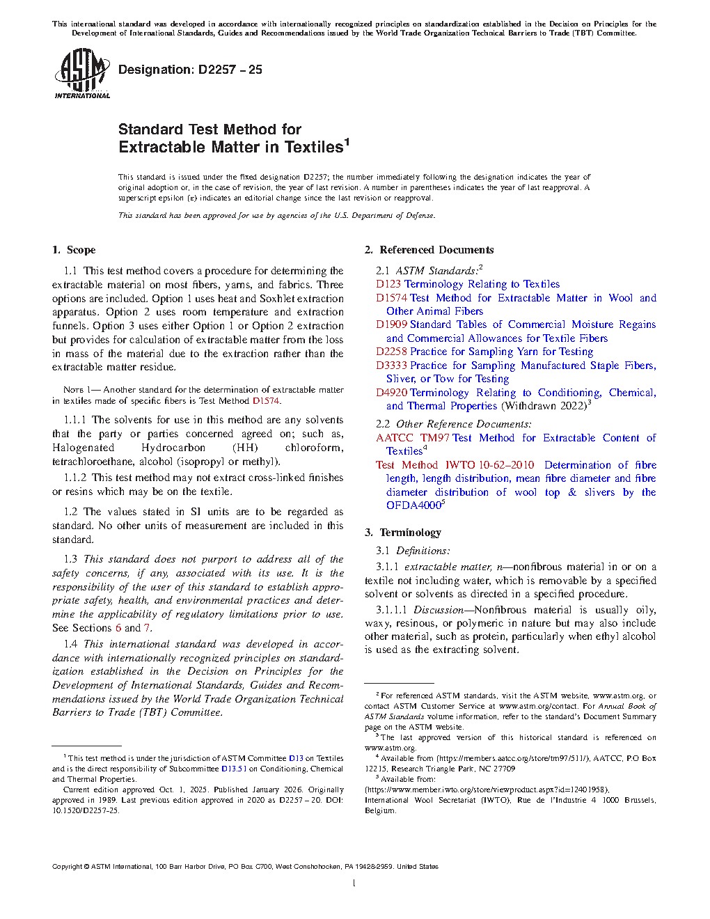 1.1 This test method covers a procedure for determining the extractable material on most fibers, yarns, and fabrics. Three options are included. Option 1 uses heat and Soxhlet extraction apparatus. Option 2 uses room temperature and extraction funnels. Option 3 uses either Option 1 or Option 2 extraction but provides for calculation of extractable matter from the loss in mass of the material due to the extraction rather than the extractable matter residue.