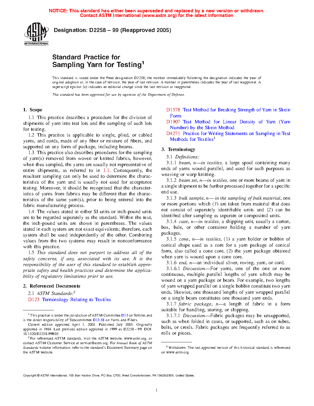 1.3 This practice also describes procedures for the sampling of yarn(s) removed from woven or knitted fabrics, however, when thus sampled, the yarns are usually not representative of entire shipments, as referred to in 1.1. Consequently, the resultant sampling can only be used to determine the characteristics of the yarn and is usually not used for acceptance testing. Moreover, it should be recognized that the characteristics of yarns from fabrics may be different than the characteristics of the same yarn(s), prior to being entered into the fabric manufacturing process.